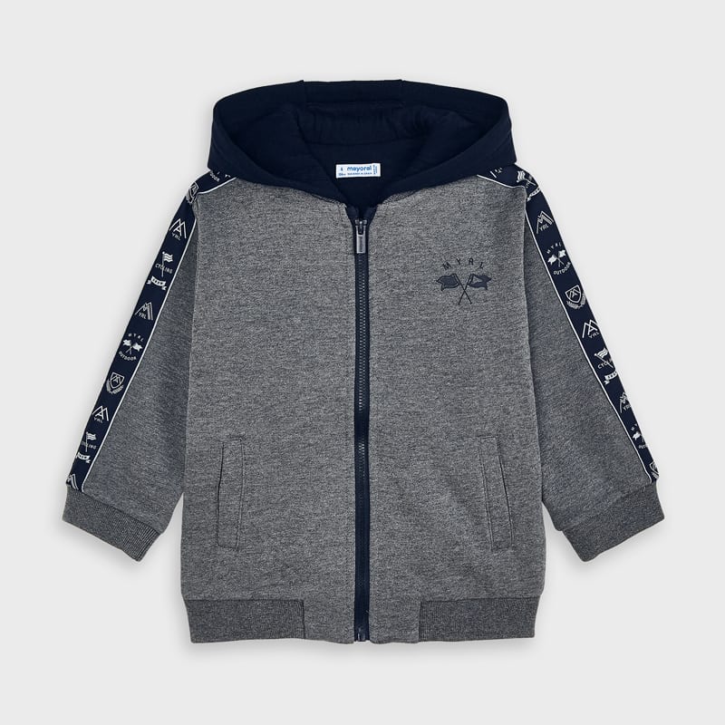 Świetna bluza Mayoral dla chłopca w szarym kolorze z kontrastowymi aplikacjami. Bluza z kapturem, zapinana na podwójny suwak.