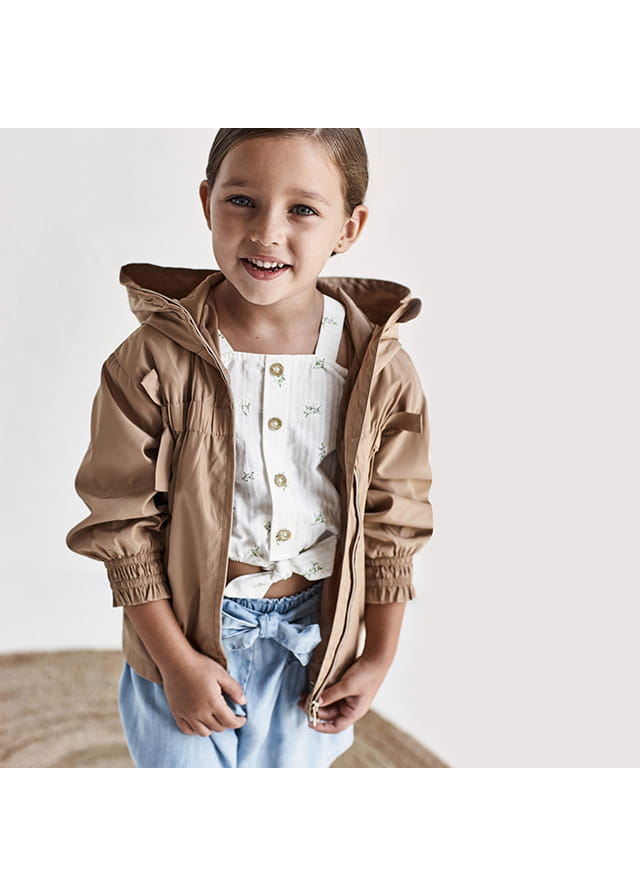 Śliczna bluzka Mayoral dla dziewczynki na ramiączkach, z opadającymi rękawkami, bluzeczka z nadrukiem, guziczkami i ozdobnym wiązaniem u dołu.