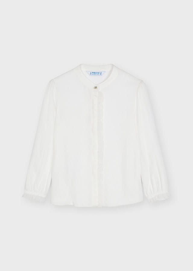 Śliczna bluzka Mayoral dla dziewczynki z długim rękawem, w kremowym kolorze, bluzka z ozdobną falbanką z przodu.
