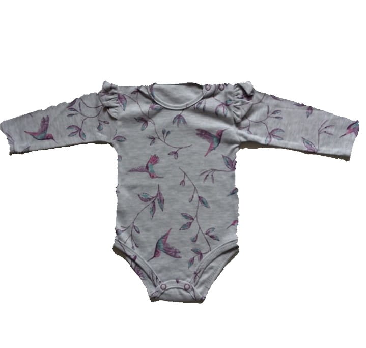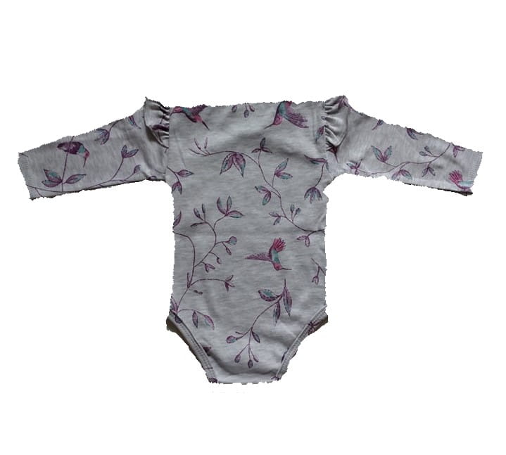 Śliczne body polskiej marki Mrofi dla dziewczynki w szarym kolorze z nadrukiem, ozdobione falbankami na ramionach, body z długim rękawem, zapinane z boku i w kroku na napy.