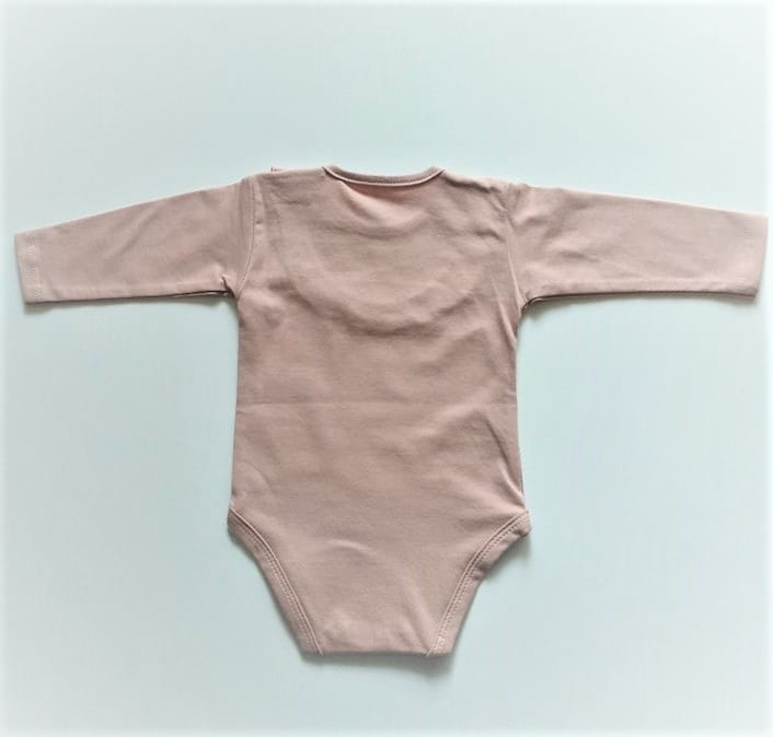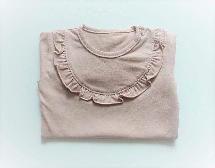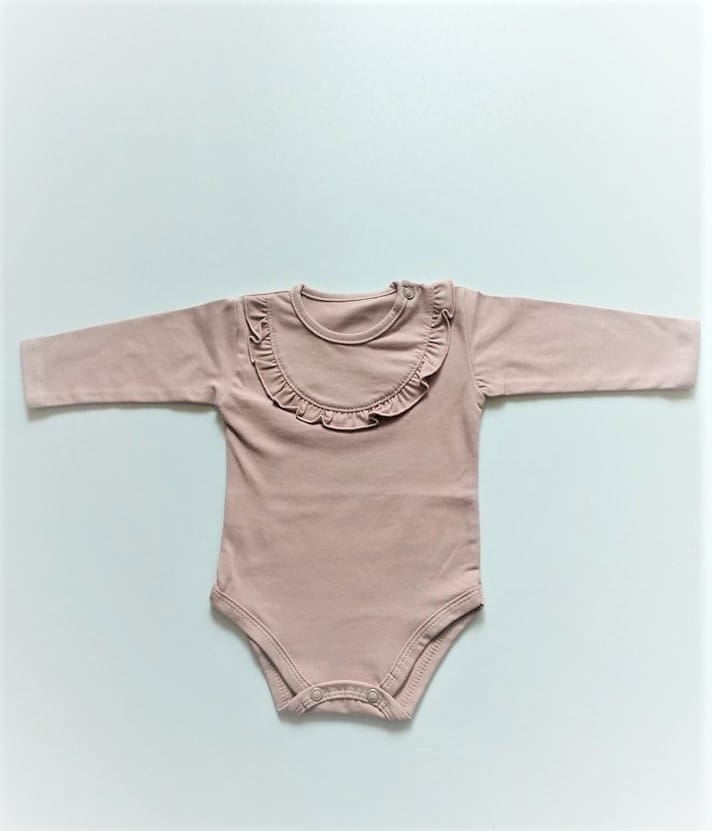 Śliczne body polskiej marki Mrofi dla dziewczynki w jasno-brązowym kolorze, ozdobione falbanką, body z długim rękawem, zapinane z boku i w kroku na napy.