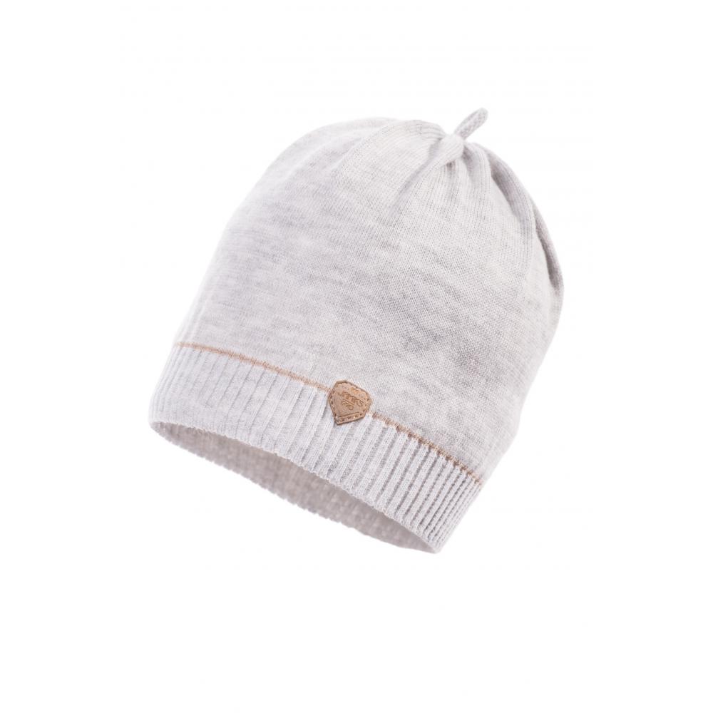 Fajna czapka dzianinowa Jamiks dla chłopca w szarym kolorze. Z boku naszyta jest ozdobna skórka z logo firmy.