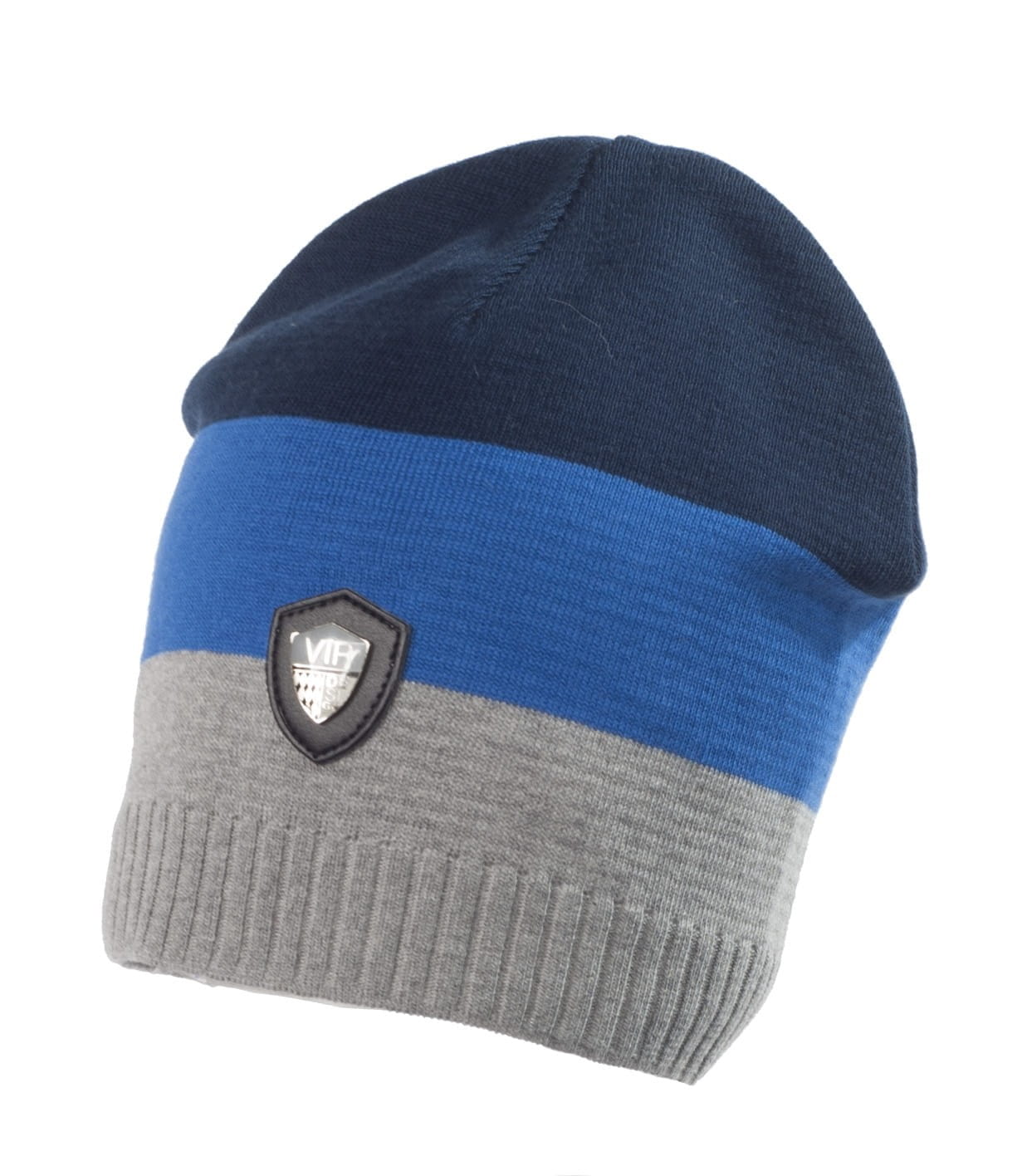 Świetna czapka dzianinowa Jamiks dla chłopca trzykolorowa z naszywką z przodu.