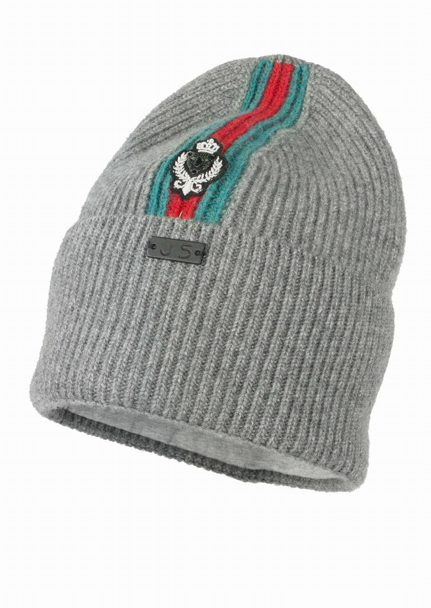 Świetna czapka Jamiks dla chłopca w popielatym kolorze z kontrastowymi wstawkami i metalową naszywką. Od wewnątrz bawełniana podszewka.