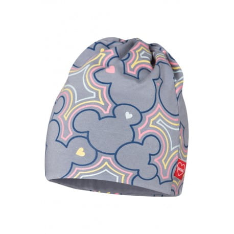Śliczna czapka Broel dla dziewczynki z tkaniny dresowej, w szarym kolorze z kolorowym nadrukiem.