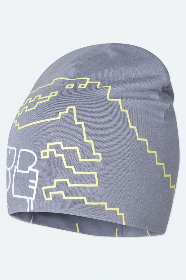 Świetna czapka Broel dla chłopca z dzianiny dresowej w szarym kolorze z grafiką dinozaura.