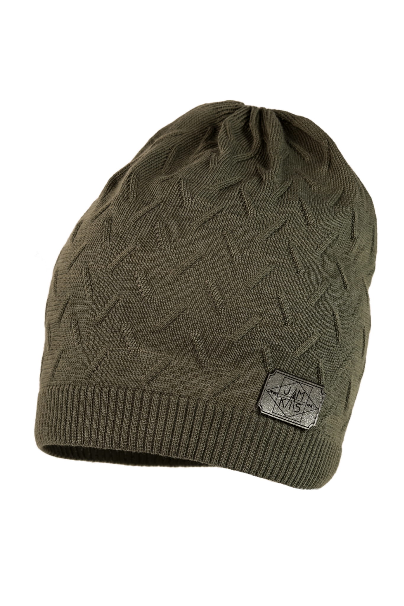 Świetna czapka dzianinowa Jamiks dla chłopca w kolorze khaki z naszywką z logo firmy.