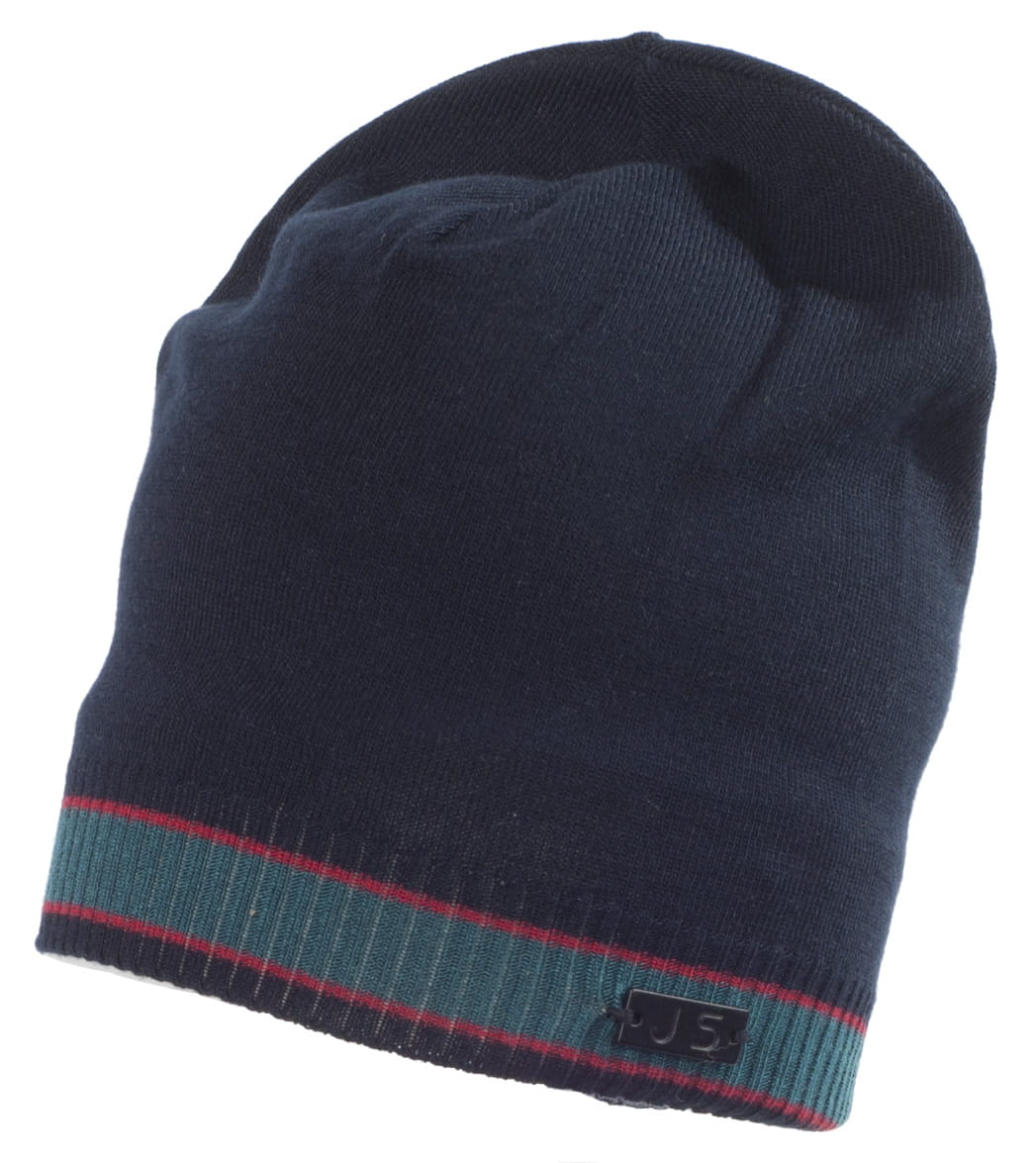Świetna czapka dzianinowa Jamiks dla chłopca w granatowym kolorze z naszywką z boku i kontrastowymi paseczkami.