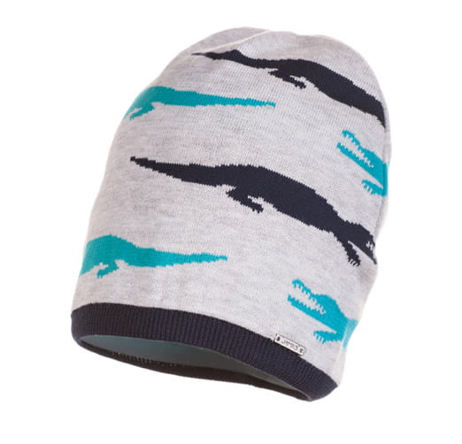 Świetna czapka dzianinowa Jamiks dla chłopca w szarym kolorze z nadrukiem krokodyli.