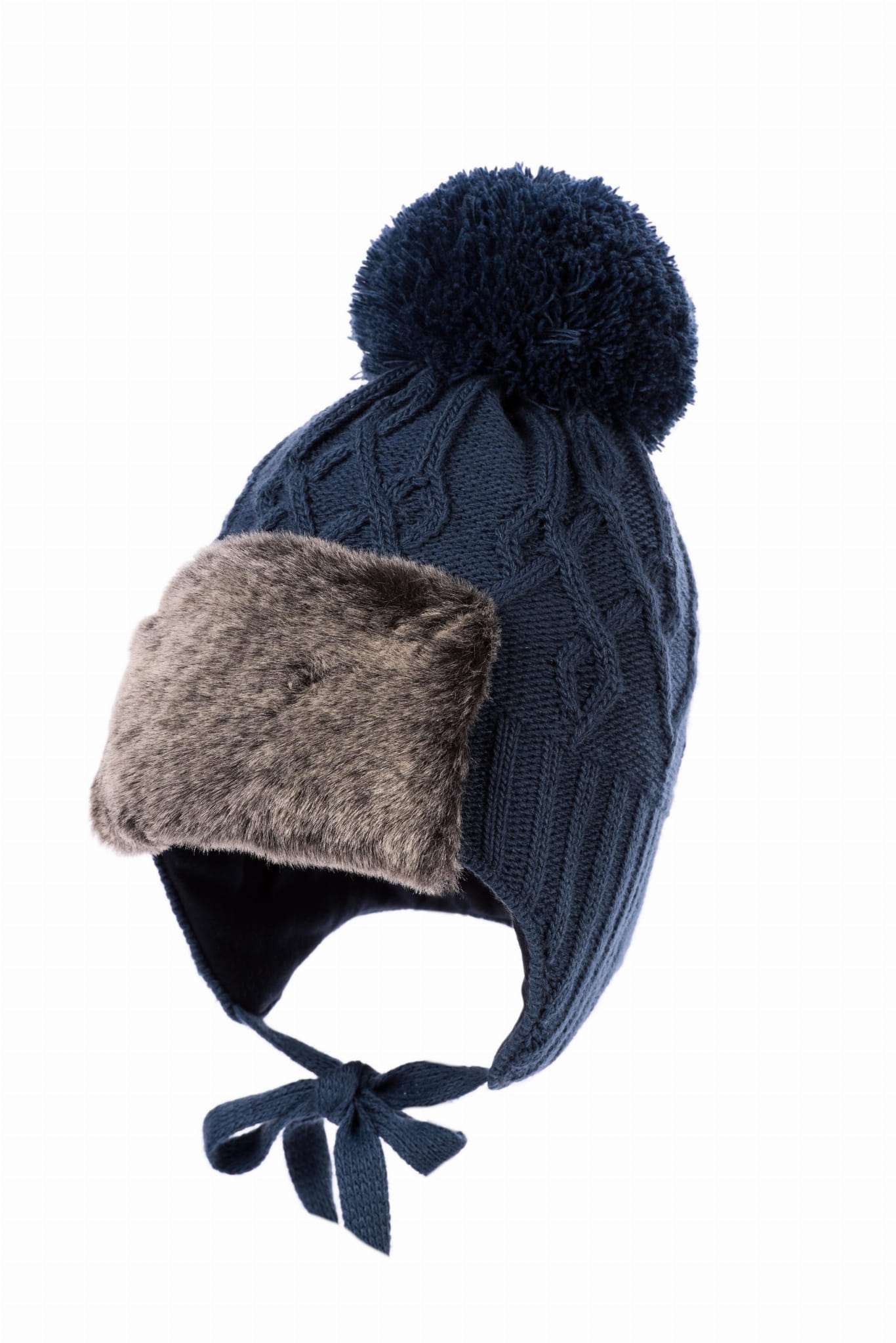 Świetna czapka Jamiks dla chłopca w ciemnym niebieskim kolorze o ciekawym splocie, z wywiniętym futerkiem i pomponem z włóczki, czapka wiązana, od wewnątrz ocieplona polarkiem.