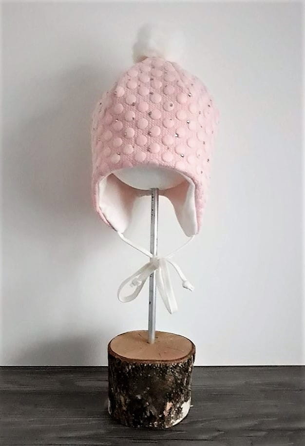 Śliczna czapka Broel dla dziewczynki w bladym różu z pomponem. Czapka ma wypukłe kropeczki i dodatkowo malutkie cyrkonie i jest wiązana pod szyją.
