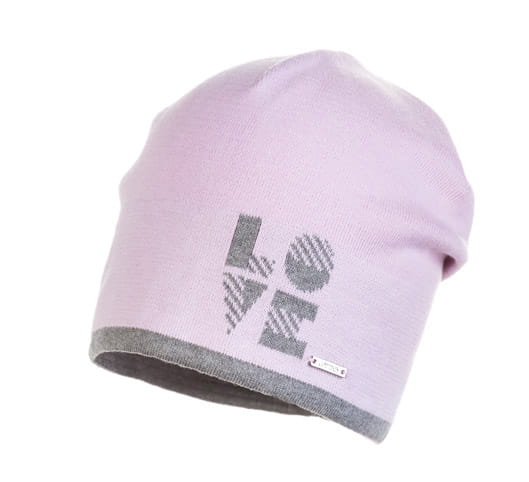 Świetna czapka dzianinowa Jamiks dla dziewczynki w różowym kolorze z szarym napisem LOVE.