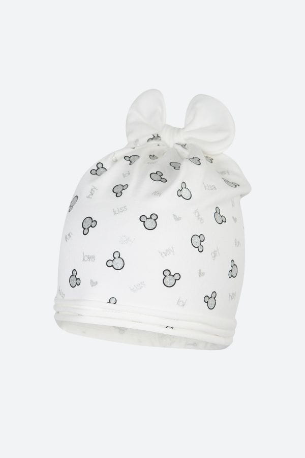 Śliczna czapka Broel dla dziewczynki w kremowym kolorze z nadrukiem i kokardą na czubku.