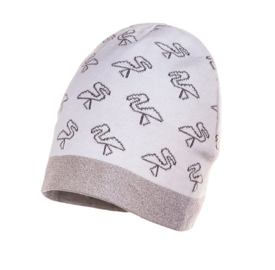 Fajna czapka dzianinowa Jamiks dla dziewczynki w białym kolorze z nadrukiem popielatych pelikanów.