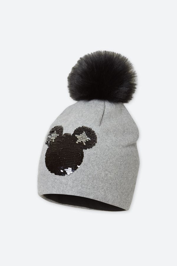 Śliczna czapka Broel dla dziewczynki w szarym kolorze z cekinową aplikacją. Czapka z pomponem. Czapka ma bawełnianą podszewkę.