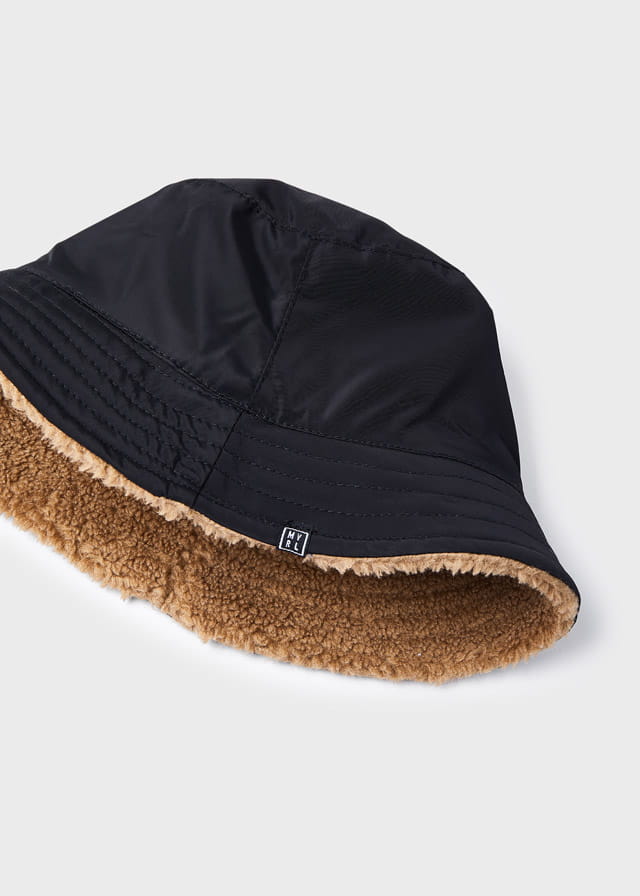 Ciepła czapka dwustronna Mayoral dla chłopca, z jednej strony czarna z ortalionu, z drugiej z jasno brązowego baranka.