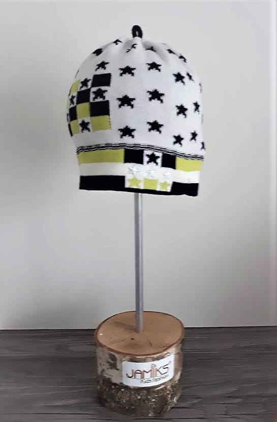 Świetna czapka dzianinowa Jamiks dla chłopca, biała w granatowe gwiazdki z limonkowymi akcentami.