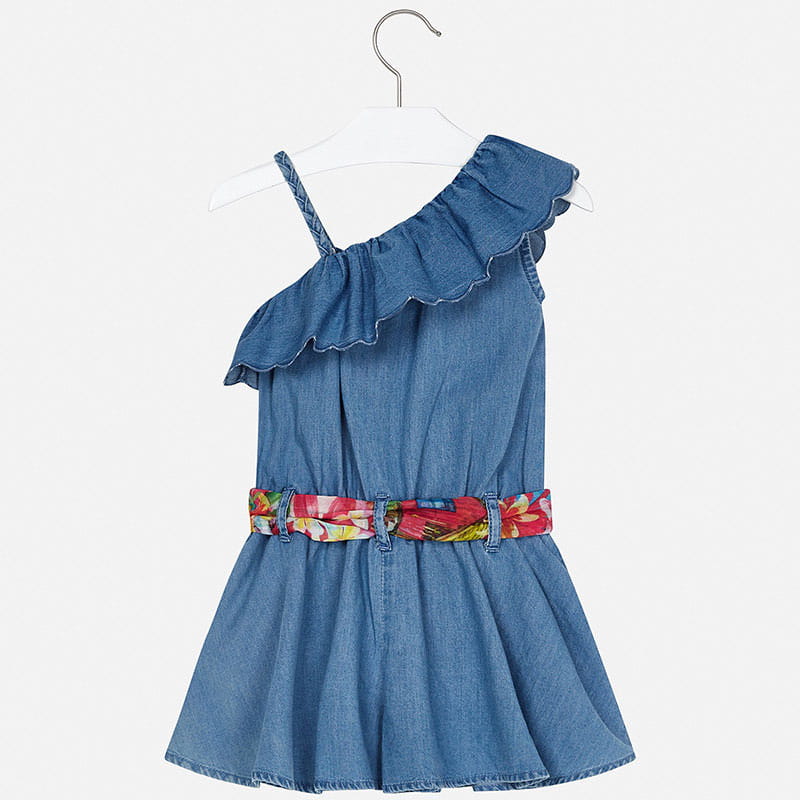 Świetny kombinezon Mayoral dla dziewczynki z mięciutkiego materiału jeansowego, o asymetrycznym dekolcie z falbanką i wyciąganym, kolorowym paseczkiem. Po bokach znajdują się funkcjonalne kieszonki.
