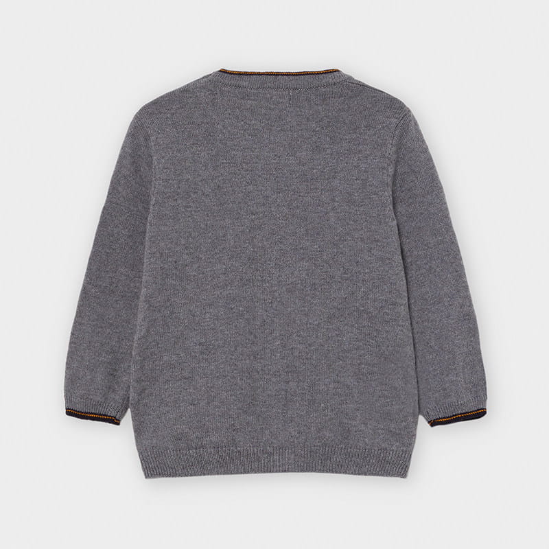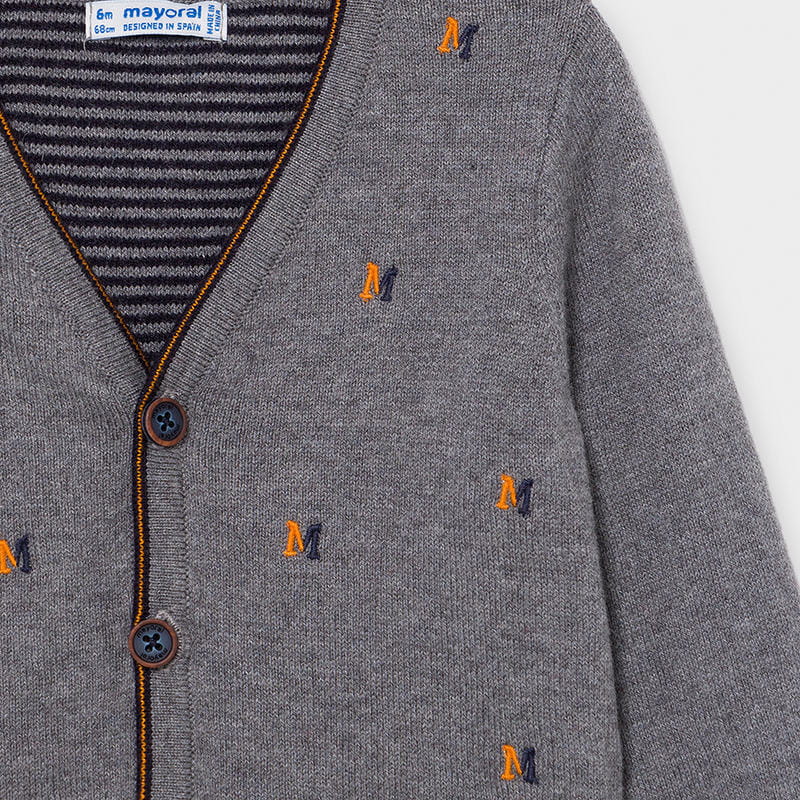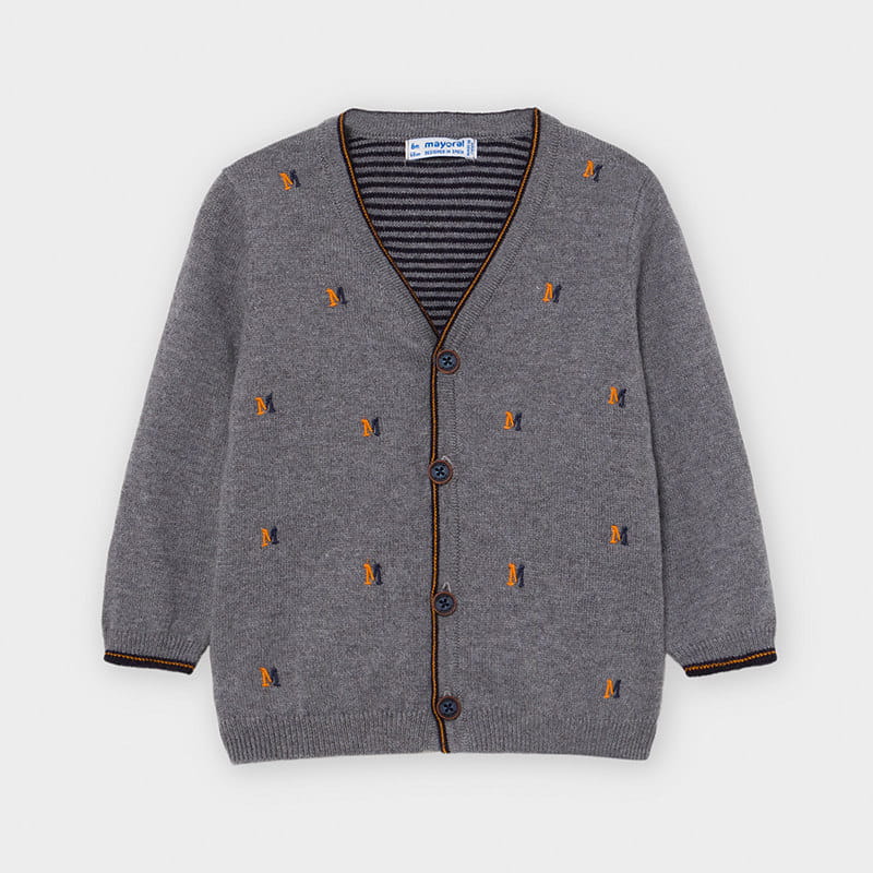 Elegancki sweter Mayoral dla chłopca w szarym kolorze, zapinany na guziczki, z ozdobnymi haftami.