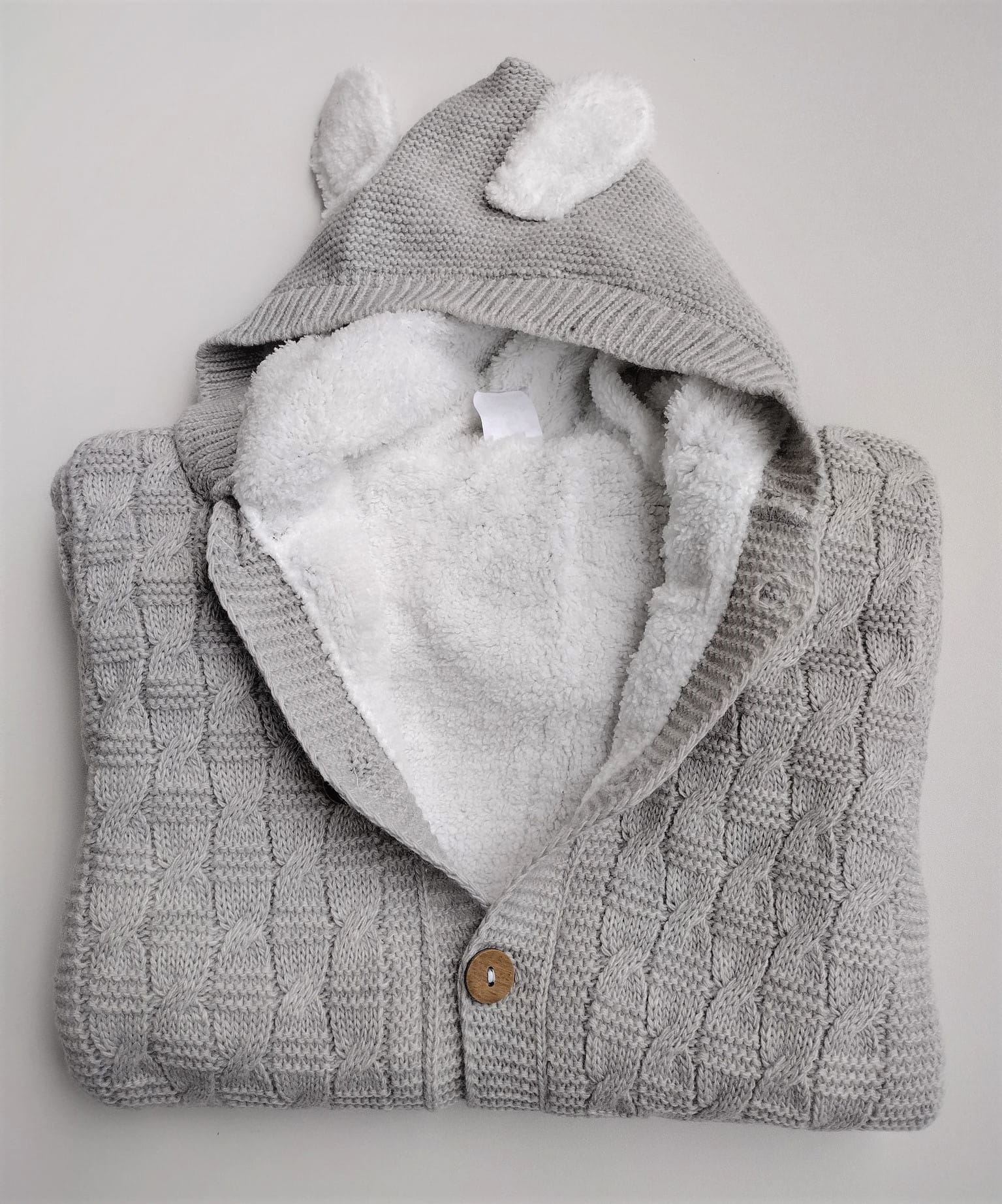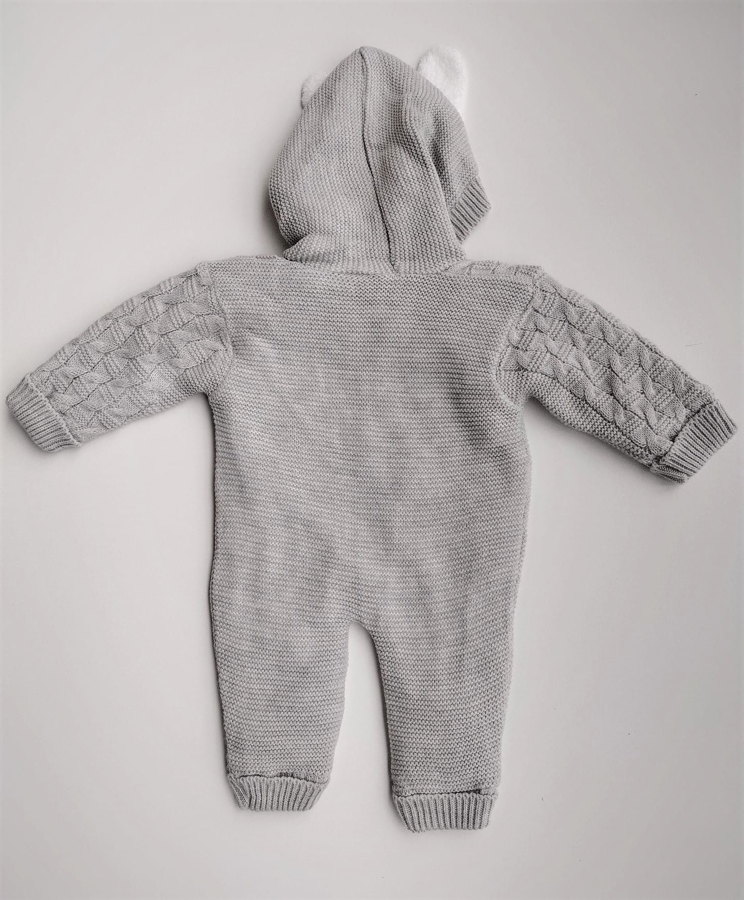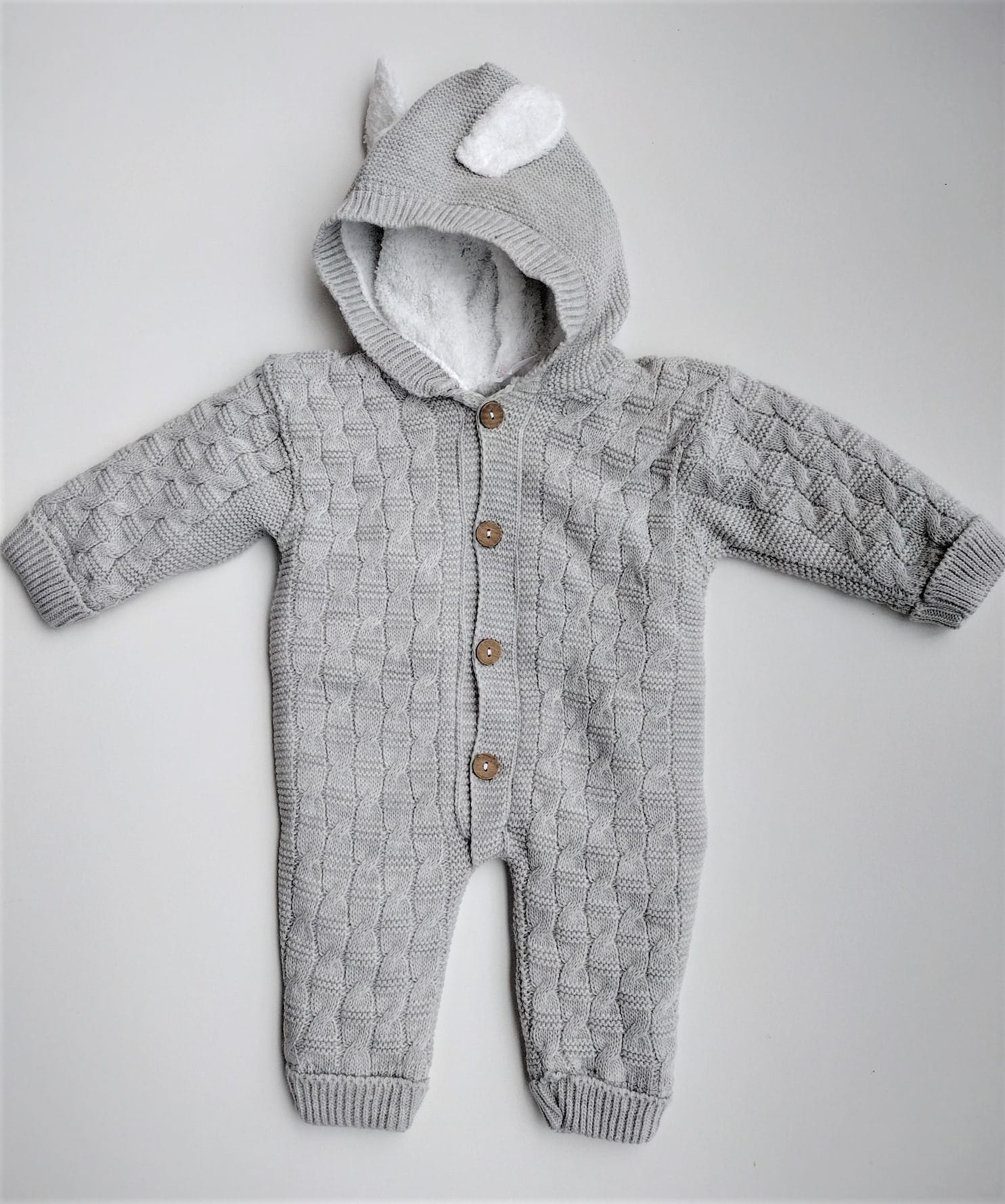 Cieplutki kombinezon trykotowy dla niemowlaka, w szarym kolorze o ciekawym splocie, kombinezon z kapturem z ozdobnymi uszkami, od wewnątrz ocieplony miękką frotą, zapinany z przodu na guziczki.