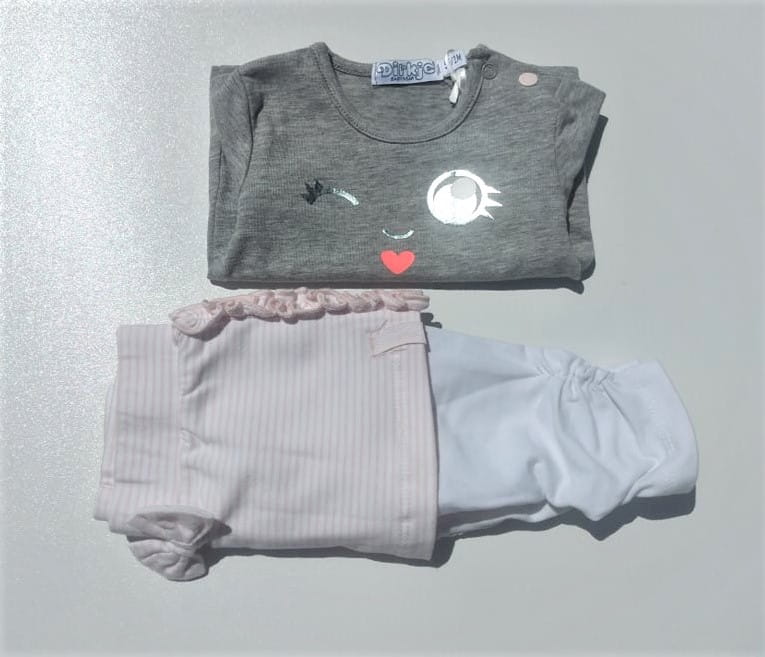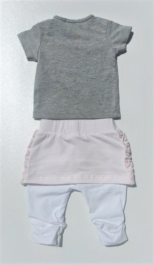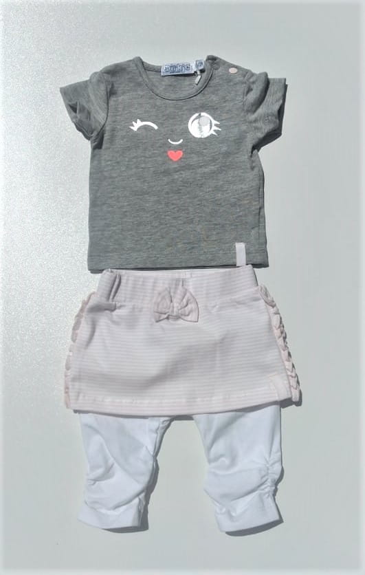 Śliczny komplet Dirkje dla dziewczynki koszulka w szarym kolorze zapinana z boku przy szyi na napy oraz białe legginsy z doszytą spódniczką w paseczki.