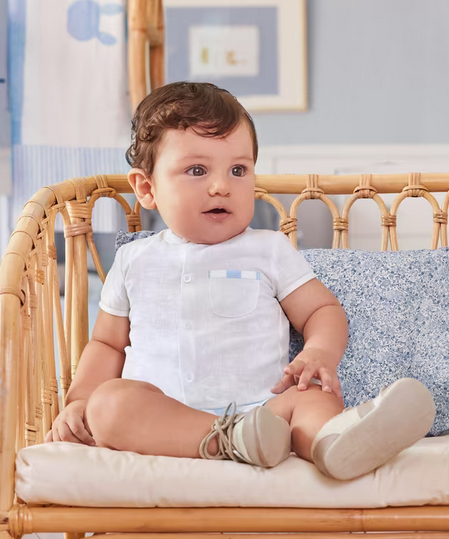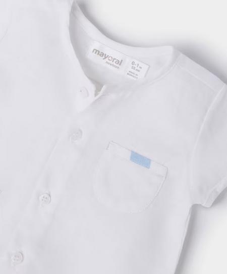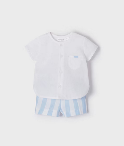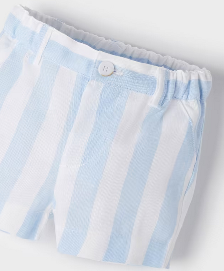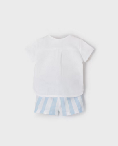 Śliczny komplet Mayoral dla chłopca-koszula na stójce z krótkim rękawkiem oraz bermudy w paski, na gumce w pasie.