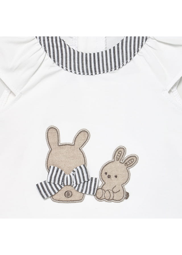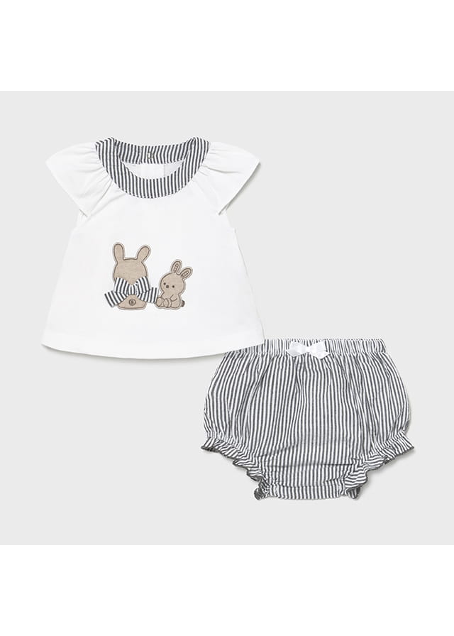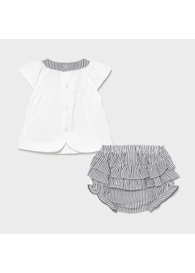Śliczny komplet Mayoral dla dziewczynki-bluzeczka z ozdobnym haftem, zapinana z tyłu na guziczki oraz szorty z falbankami.