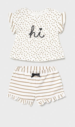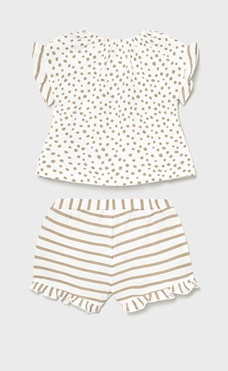 Śliczny komplet Mayoral dla dziewczynki-bluzeczka w groszki z falbankami przy rękawkach, zapinana z tyłu na guziczki oraz szorty w paseczki z falbankami.