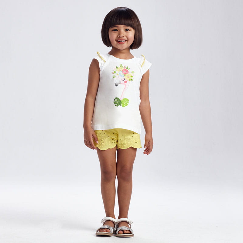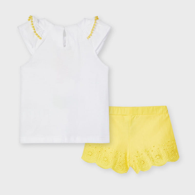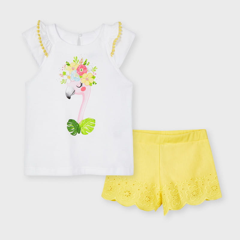 Śliczny komplet Mayoral dla dziewczynki-koszulka w białym kolorze z kolorowym nadrukiem, krótkim rękawkiem z ozdobnymi falbankami oraz żółte szorty z haftem, na gumce w pasie.