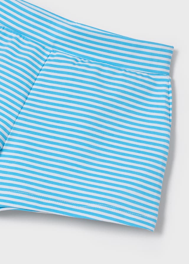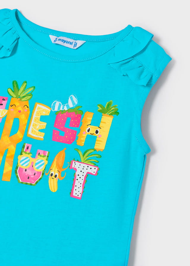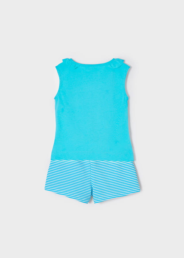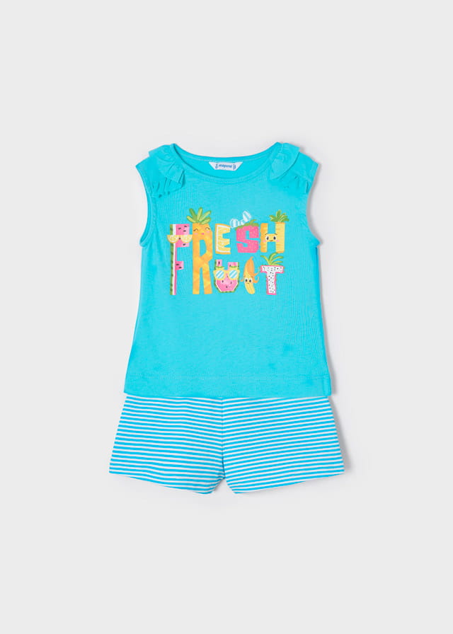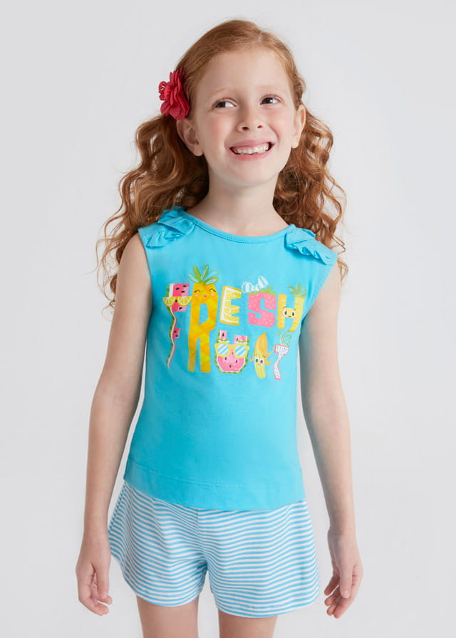 Śliczny komplet Mayoral dla dziewczynki-koszulka w turkusowym kolorze z kolorowym nadrukiem, oraz szorty w paseczki, na gumce w pasie.