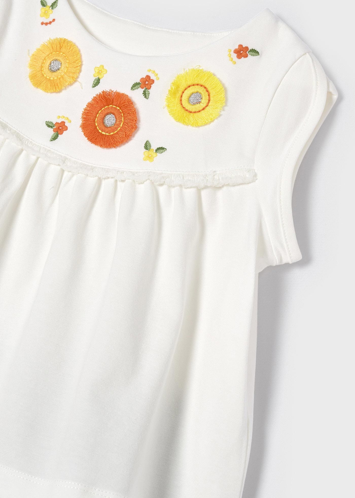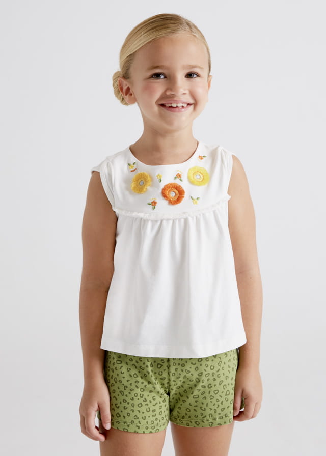 Śliczny komplet Mayoral dla dziewczynki-koszulka z ozdobnymi aplikacjami, krótkim rękawkiem oraz szorty we wzorki, na gumce w pasie.