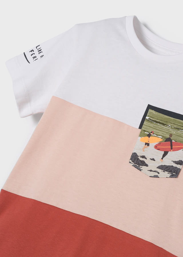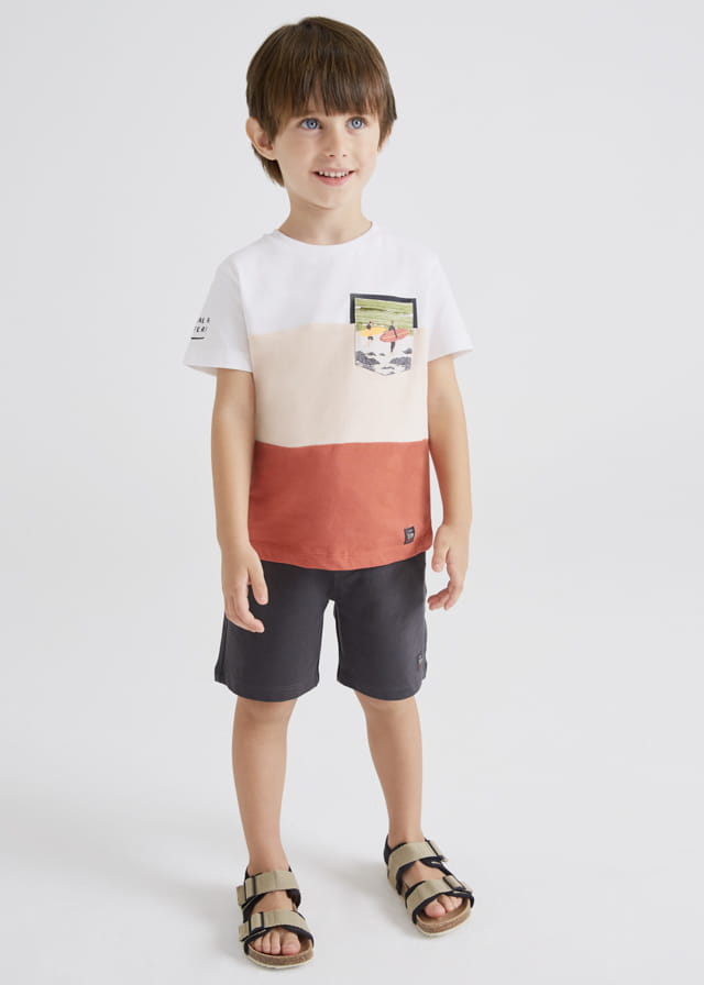 Fajny komplet Mayoral dla chłopca, koszulka trzy-kolorowa z kieszonką i krótkim rękawkiem oraz bermudy na gumce w pasie i z sznureczkiem do regulacji.