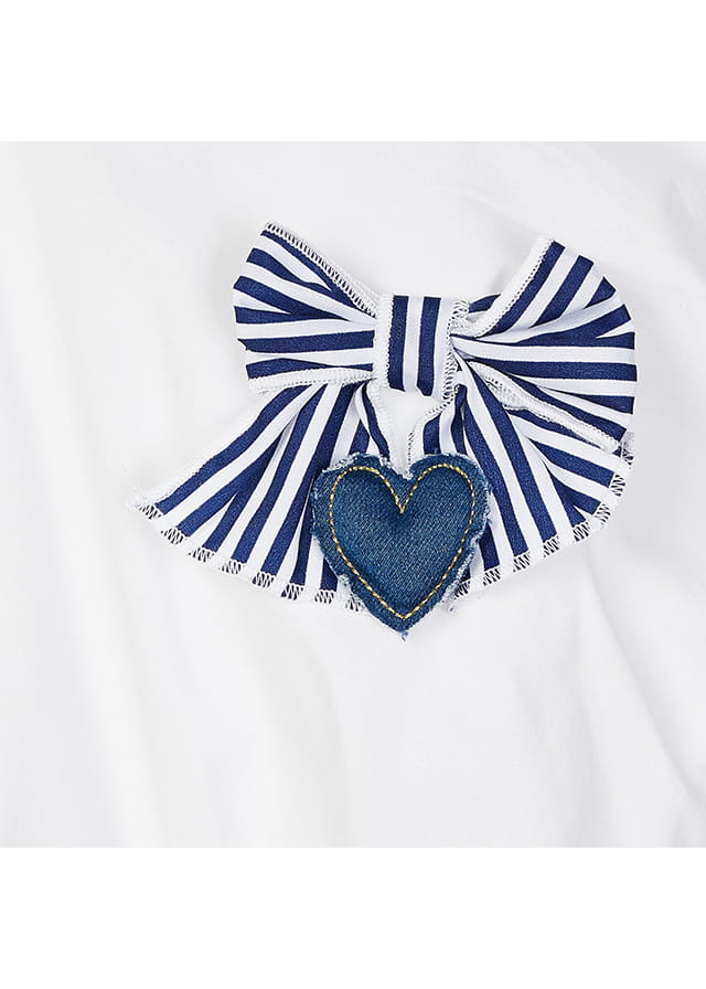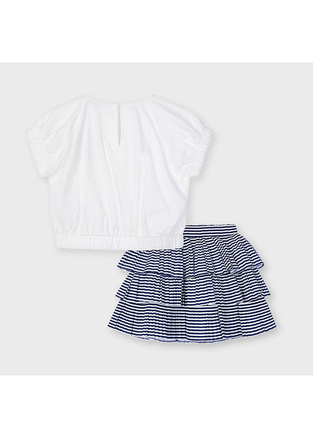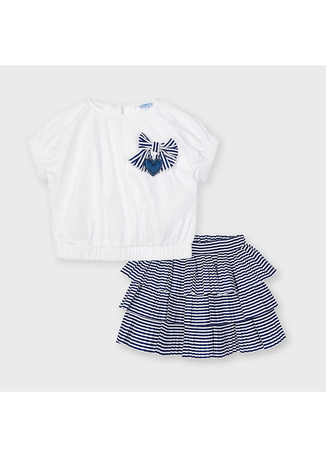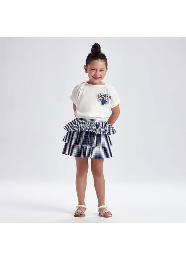 Świetny komplet Mayoral dla dziewczynki-biała bluzka z krótkim rękawkiem, zakończona ściągaczami z ozdobną kokardką na piersi, do kompletu spódniczka plisowana w paseczki, składająca się z trzech warstw falbanek. Spódniczka na gumce w pasie.