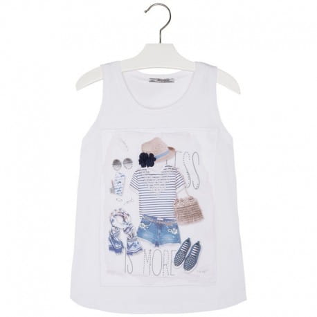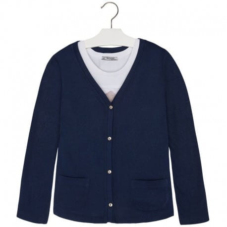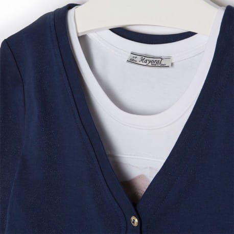 Fajny komplet Mayoral dla dziewczynki składający się z koszulki na ramiączkach z ciekawym obrazkiem i bluzki-narzutki w granatowym kolorze zapinanej na guziczki.