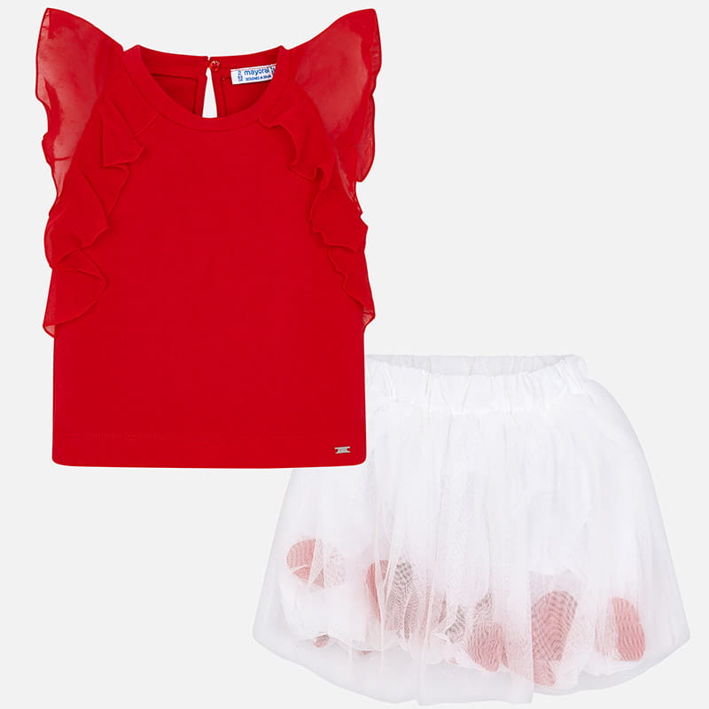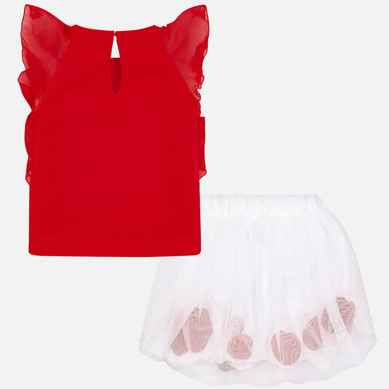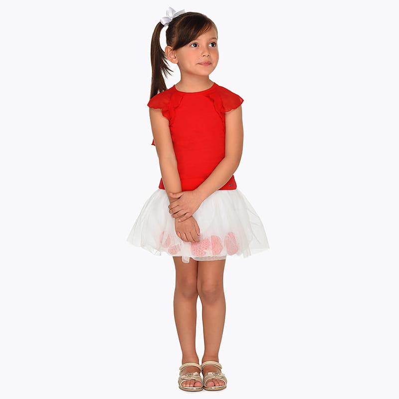 Śliczny komplet Mayoral dla dziewczynki-czerwona koszulka z motylkowym rękawkiem, zapinana z tyłu na guziczek i do kompletu efektowna biała spódniczka tiulowa z ruchomymi płatkami pod warstwą tiulu. Spódniczka na gumce w pasie.