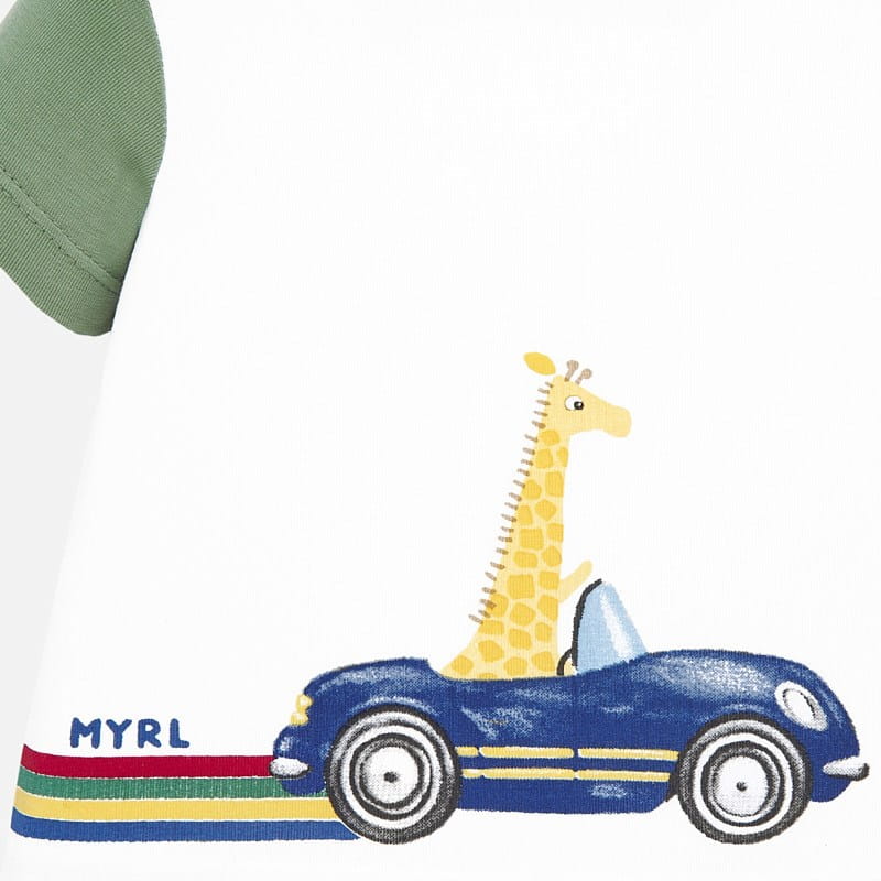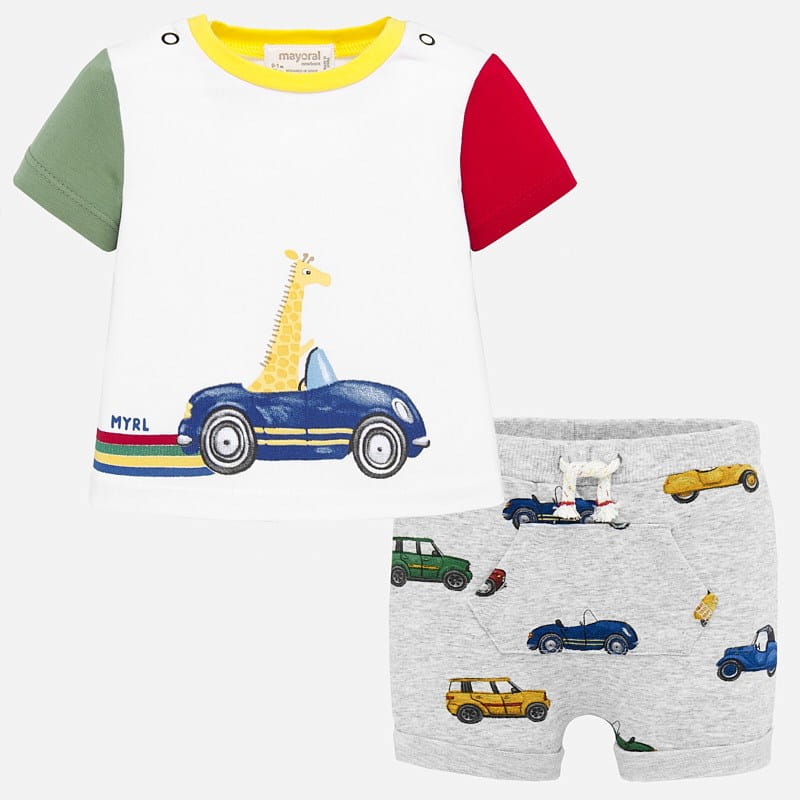 Świetny komplet Mayoral koszulka z nadrukiem i krótkim rękawkiem, zapinana przy szyi na napy i szorty z kolorowym nadrukiem, kieszonką typu kangurka, na gumce w pasie i sznureczkiem dla lepszego dopasowania.