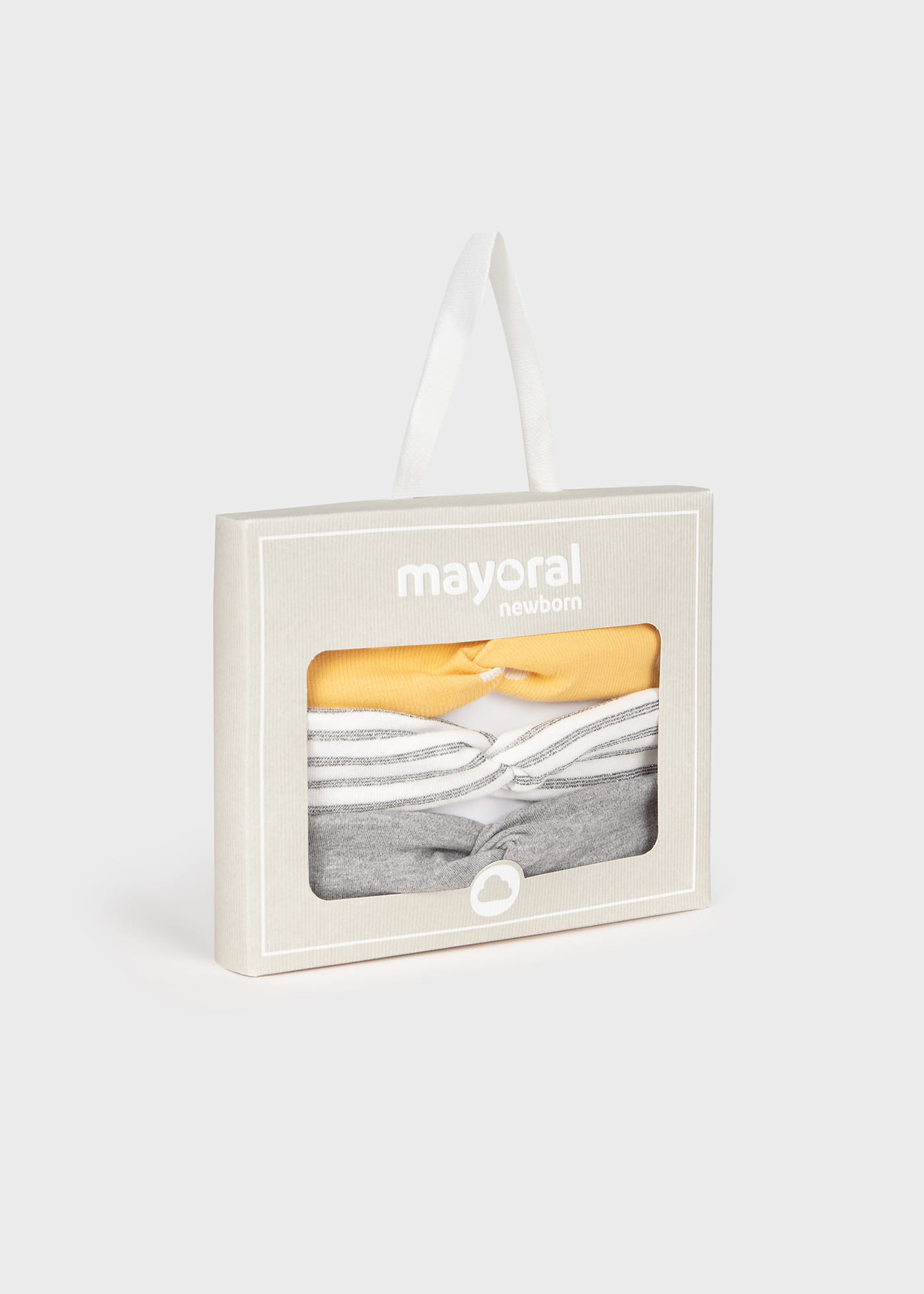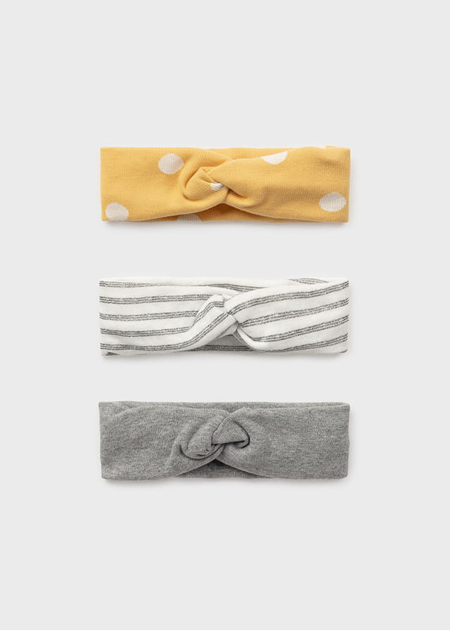 Komplet trzech uroczych opasek Mayoral dla dziewczynki-musztardowa w grochy, biała w paseczki i szara. Opaski zapakowane w ozdobne pudełeczko.