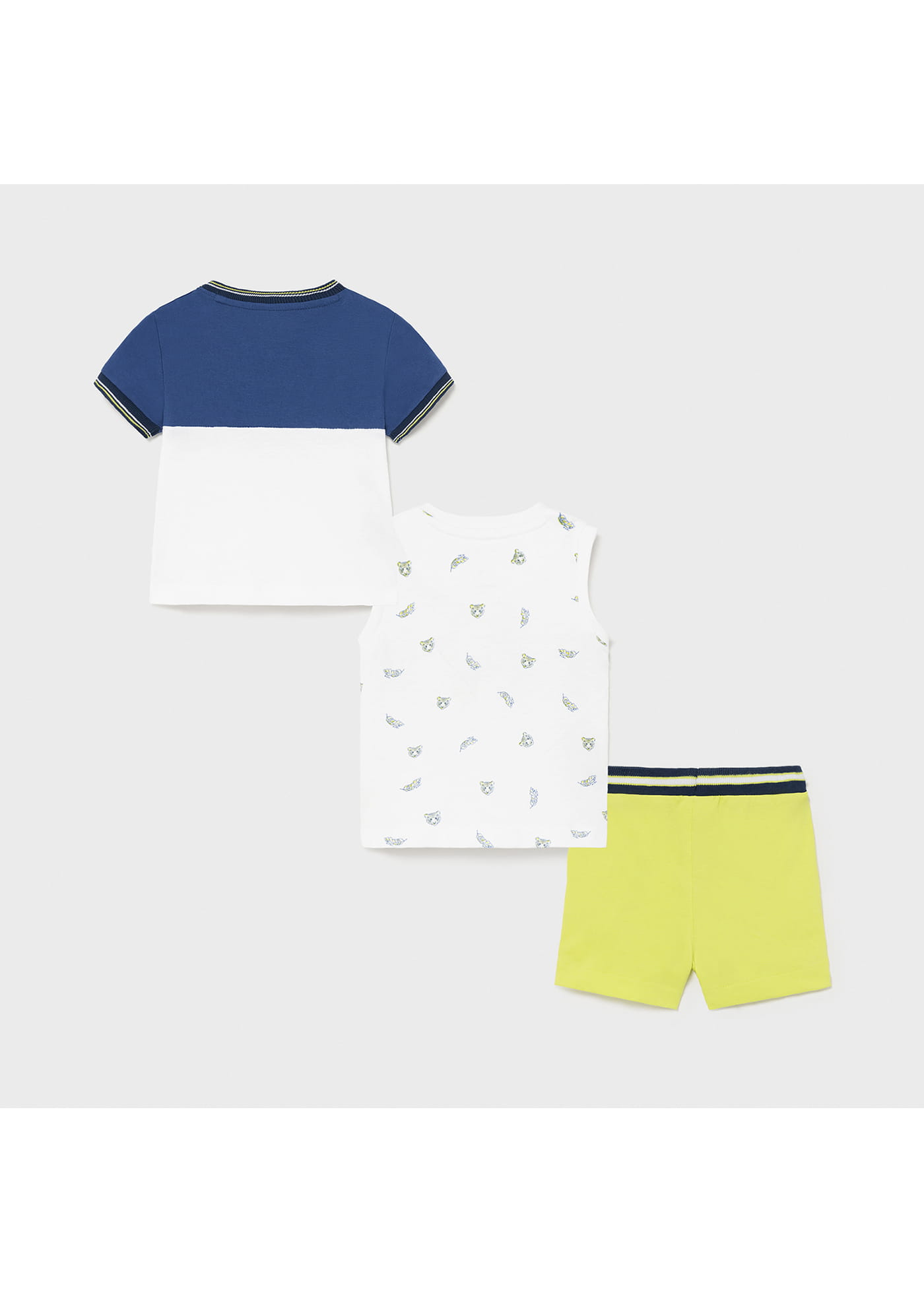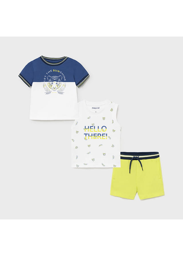 Świetny komplet Mayoral dla chłopca składający się z koszulki z krótkim rękawem, koszulki na szerokich ramiączkach we wzory i bermudów na gumce w pasie.