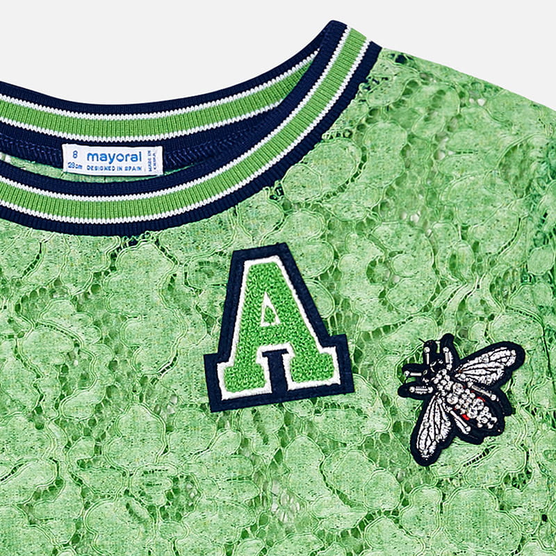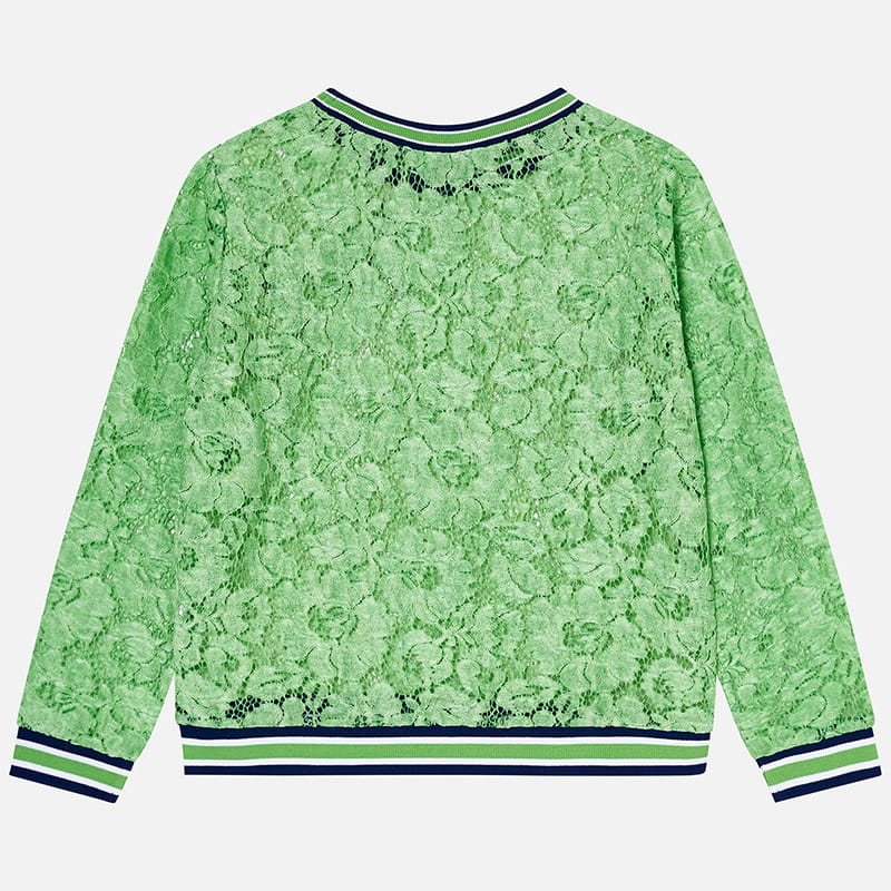 Świetna bluza Mayoral dla dziewczynki z koronki w miętowym kolorze, bluza z kontrastowymi ściągaczami i modnymi naszywkami.