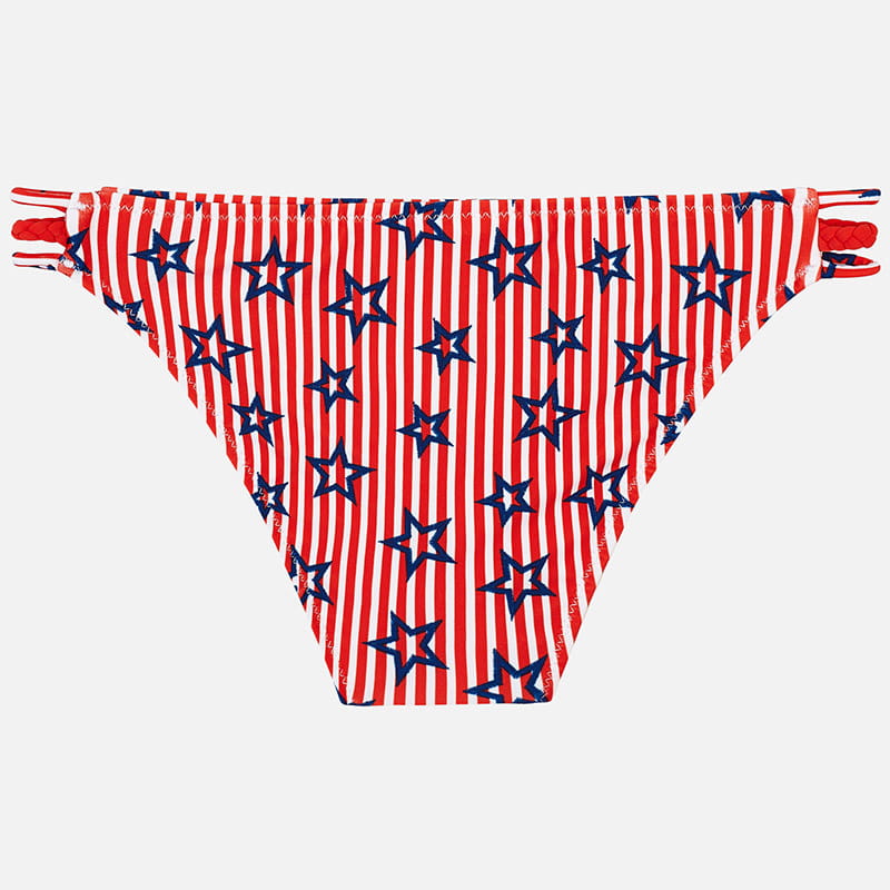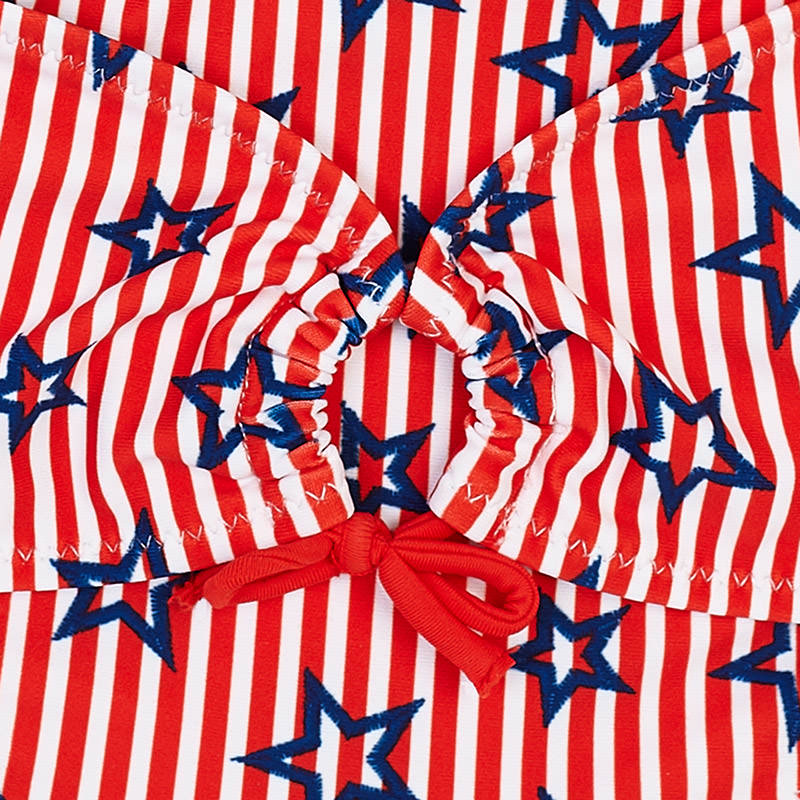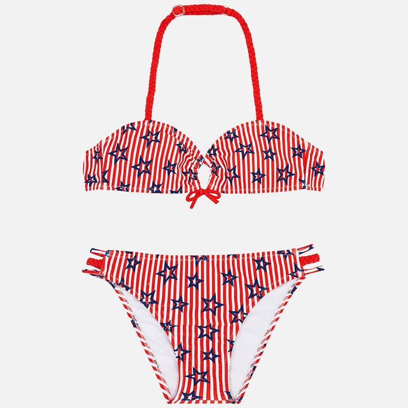 Fajny kostium kąpielowy dwu-częściowy Mayoral dla dziewczynki w czerwono-białe paseczki z nadrukiem granatowych gwiazdek.