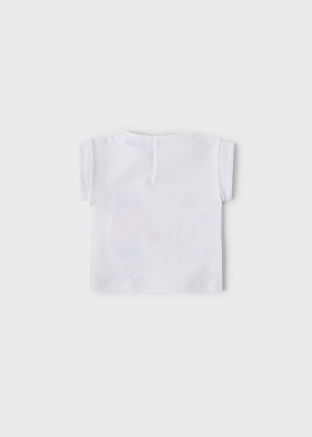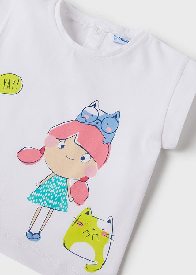 Śliczna koszulka Mayoral dla dziewczynki w białym kolorze z nadrukiem. Koszulka z krótkim rękawkiem, zapinana z tyłu na dwa napy.