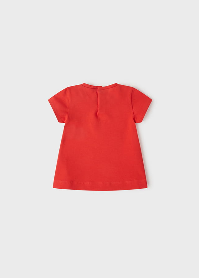 Śliczna koszulka Mayoral dla dziewczynki w czerwonym kolorze z nadrukiem. Koszulka z krótkim rękawkiem, zapinana z tyłu na dwa napy.