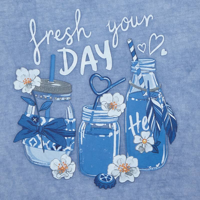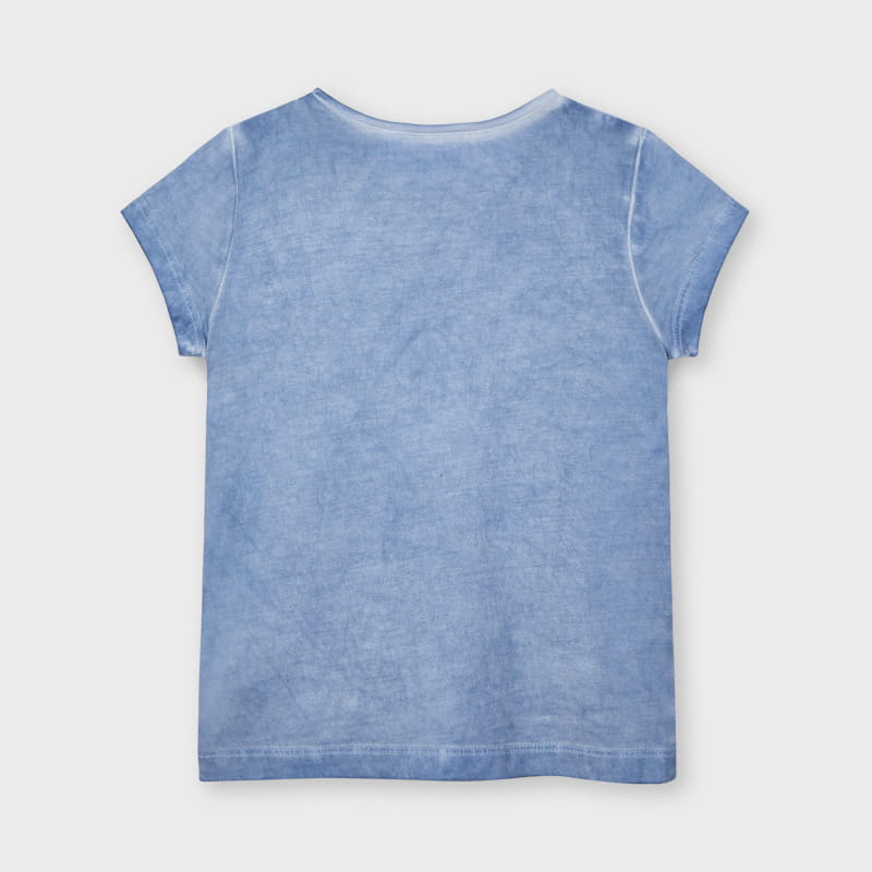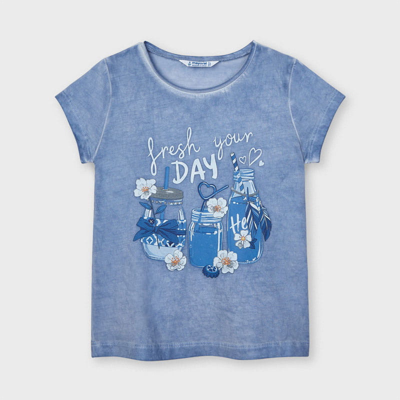 Śliczna koszulka Mayoral dla dziewczynki w niebieskim kolorze z efektem sprania, koszulka z kolorowym nadrukiem koktajlów i z krótkim rękawkiem.