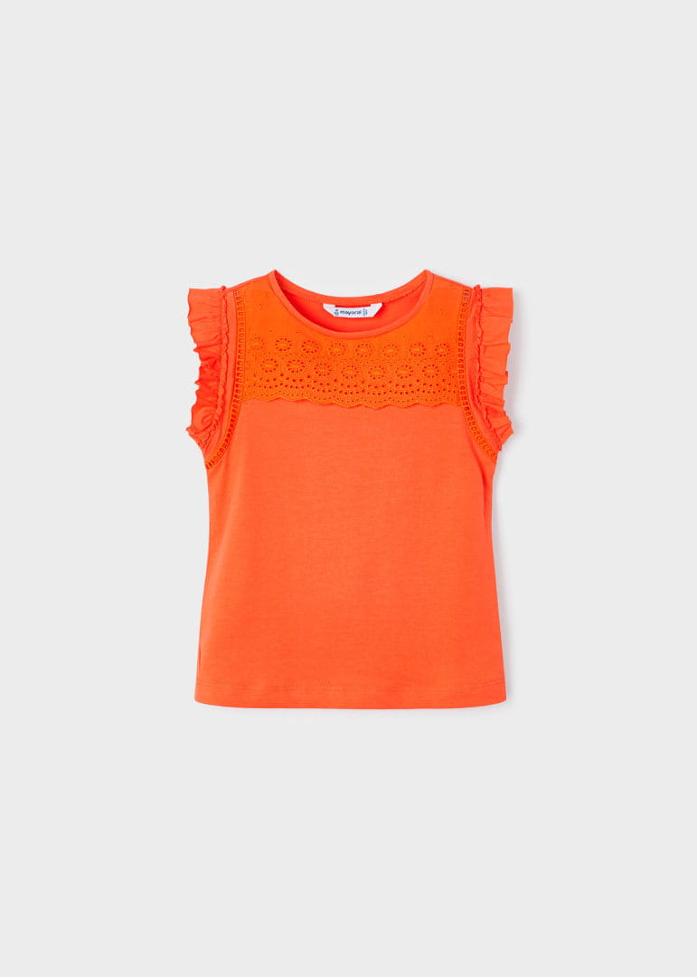 Śliczna koszulka Mayoral dla dziewczynki w modnym pomarańczowym kolorze, ozdobiona haftem, koszulka z rękawkami w formie falbanek.