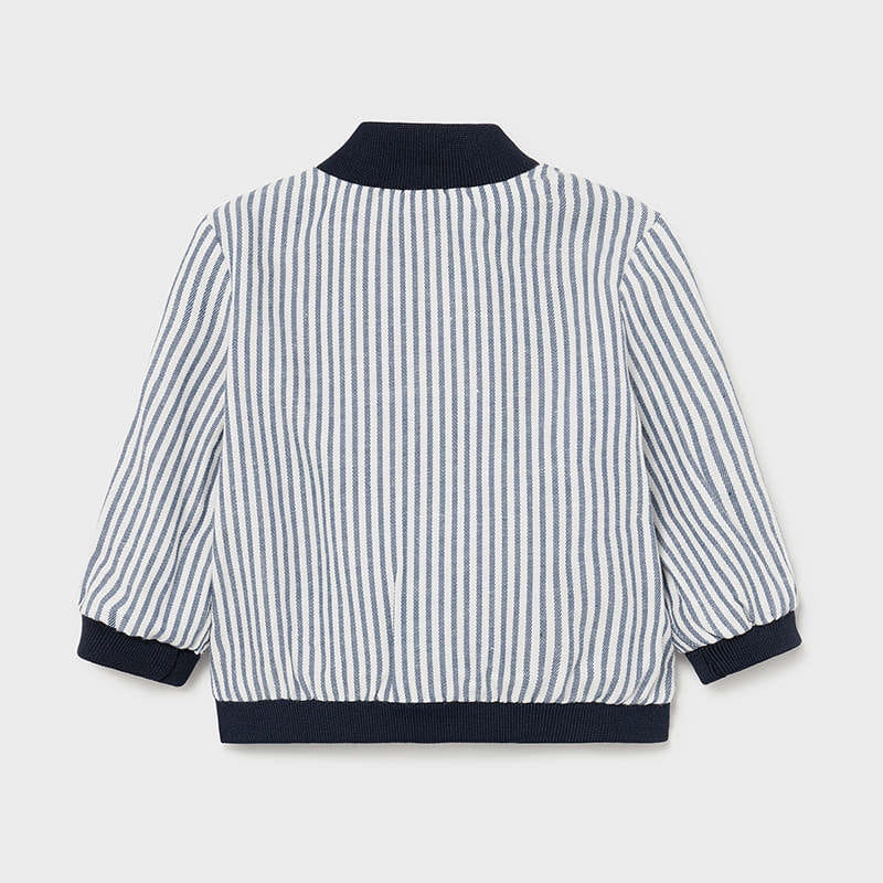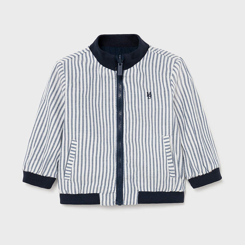 Świetna kurtka przeciwwiatrowa Mayoral dla chłopca, kurtka dwustronna-z jednej strony granatowa z funkcjonalnymi kieszonkami, z drugiej w biało-niebieskie paseczki.
