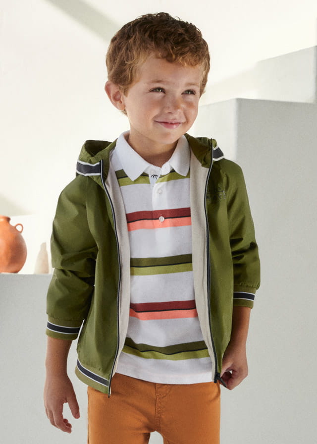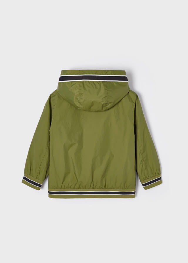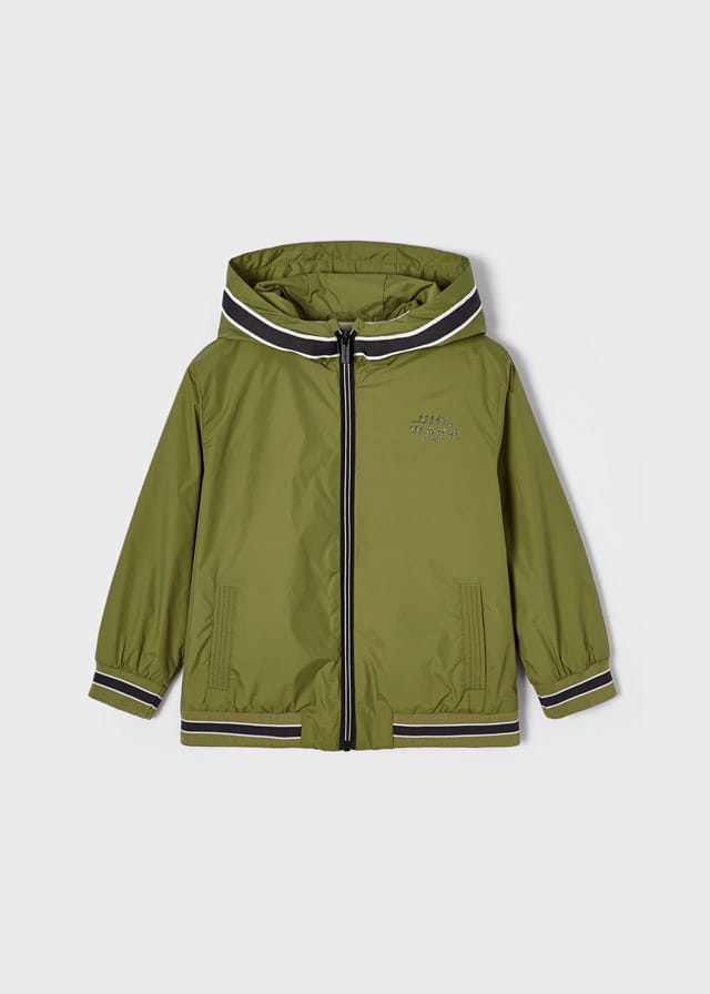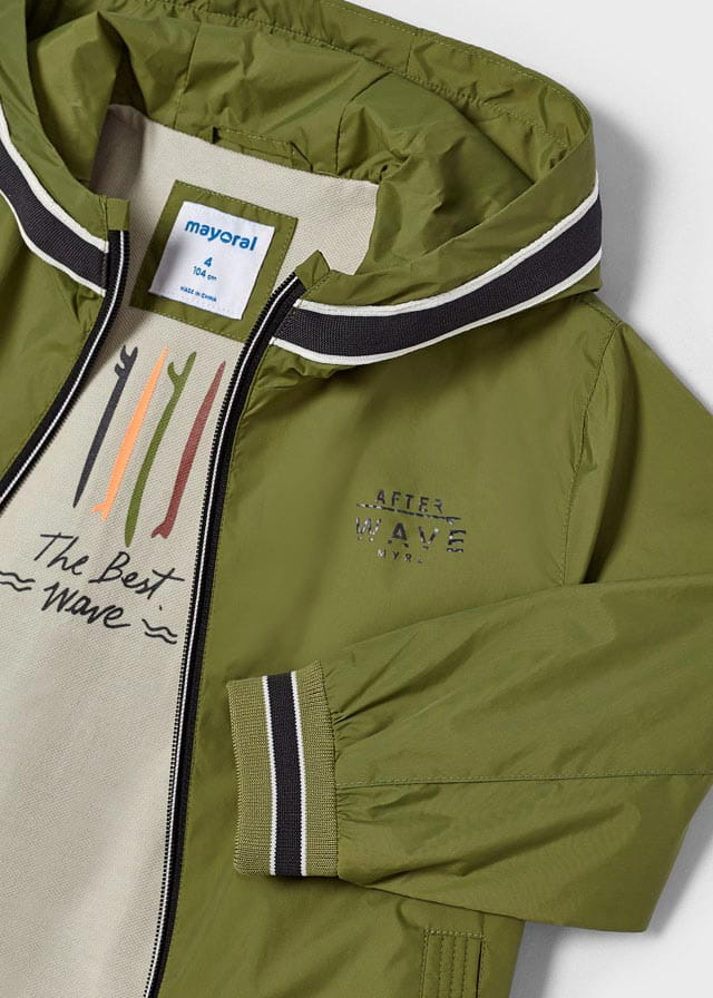 Świetna kurtka przeciwwiatrowa Mayoral dla chłopca w kolorze khaki, kurtka z kapturem i z kontrastowymi wykończeniami, po bokach funkcjonalne kieszonki.