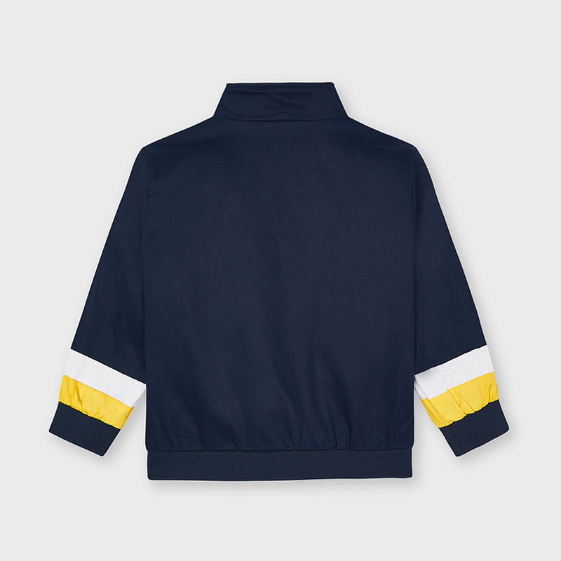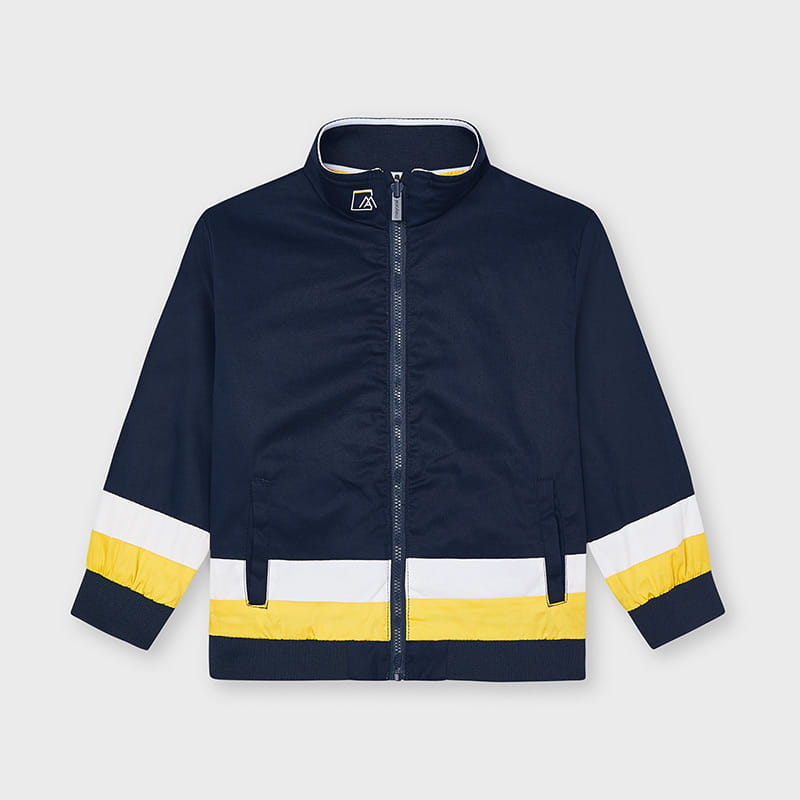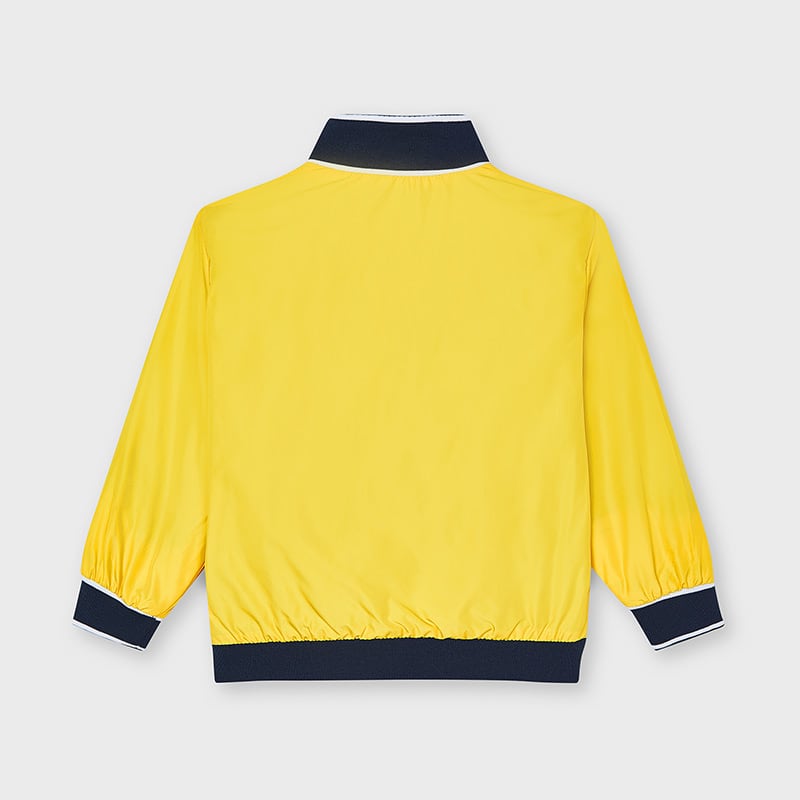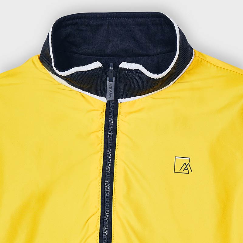 Świetna kurtka dwustronna, przeciwwiatrowa Mayoral dla chłopca-z jednej strony żółta z kontrastowymi wykończeniami, z drugiej granatowa z aplikacjami. Kurtka zapinana na suwak z bocznymi kieszonkami.