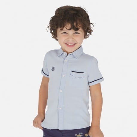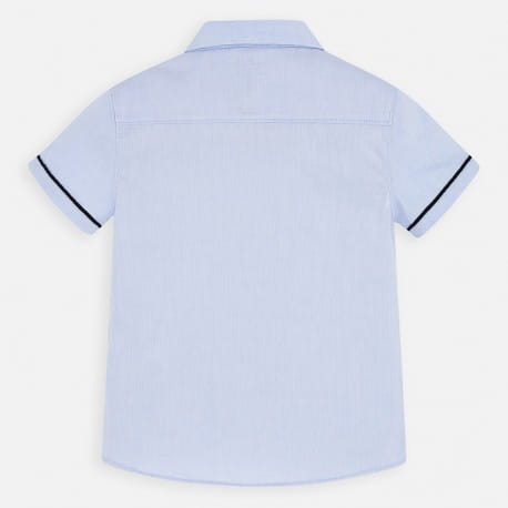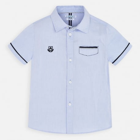 Elegancka koszula Mayoral dla chłopca w niebieskim kolorze z granatowymi aplikacjami. Koszula z krótkim rękawem.