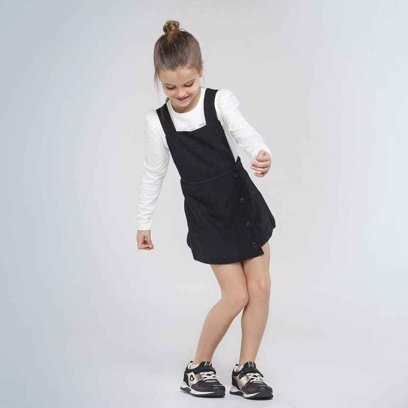 Świetna ogrodniczka Mayoral dla dziewczynki w czarnym kolorze, zapinana na kryty suwak z boku, w pasie gumka z możliwością regulacji, z przodu ozdobne guziki.
