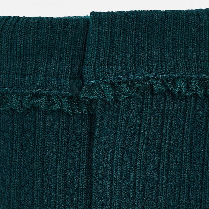 Prążkowane podkolanówki Mayoral, odwijane z falbanką w kolorze butelkowej zieleni.